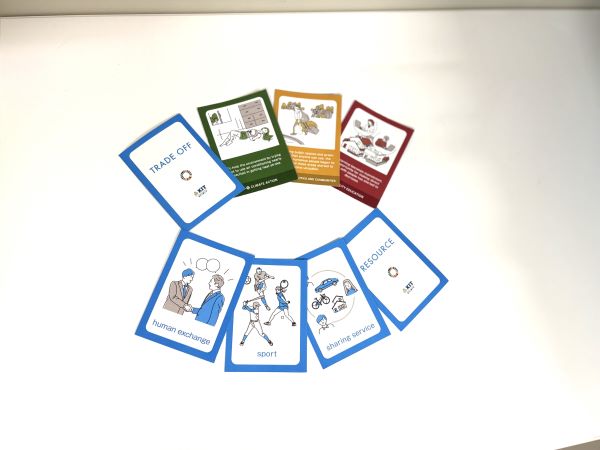 トレードオフカードに書かれている課題に対して、配られたリソースカード(課題解決のための資源カード)を使って、課題解決のアイディアを考え、グループでどのように解決をするか話し合います。