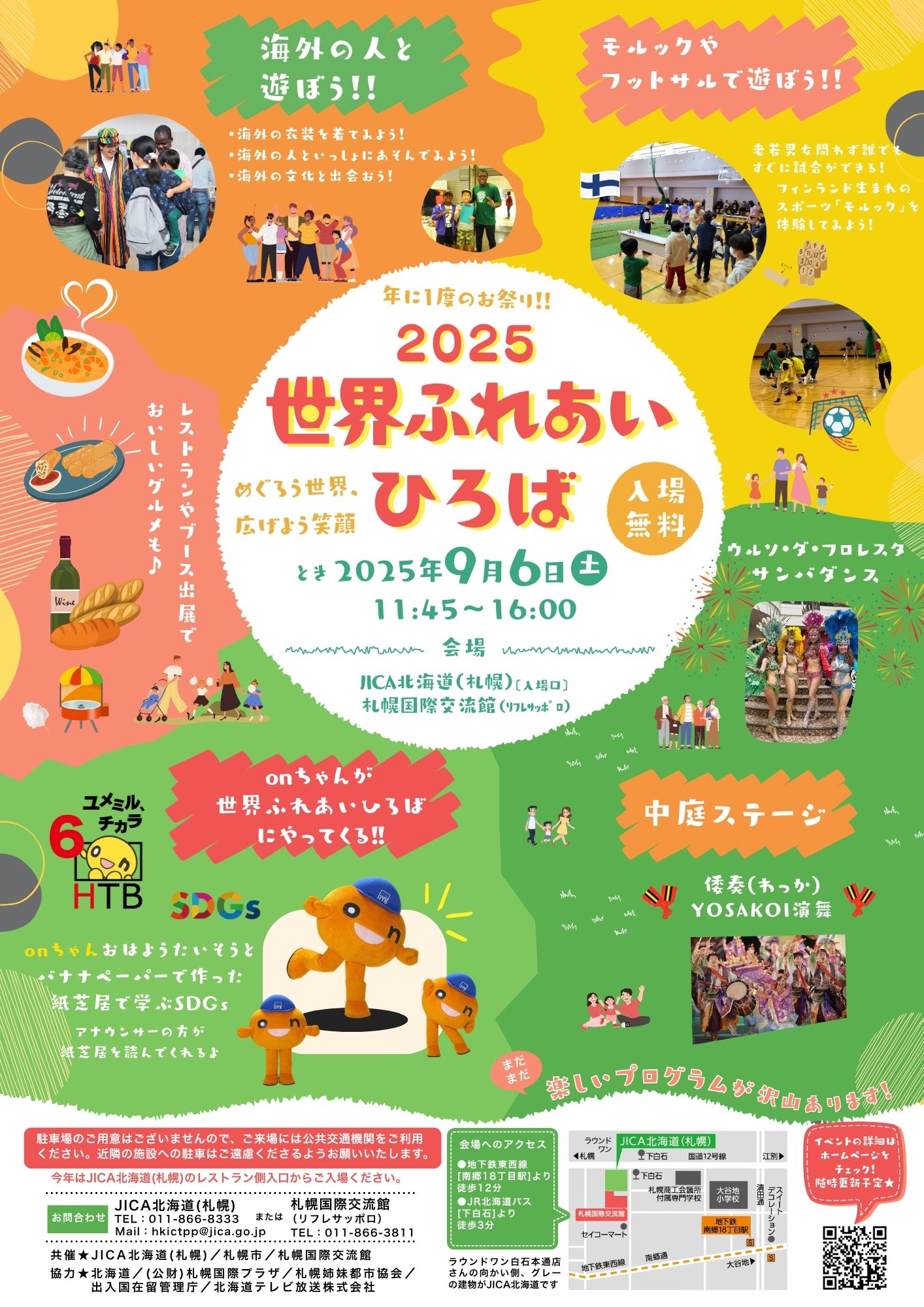 2025年9月6日(土)、札幌市白石区にあるJICA北海道センターと札幌国際交流館(リフレサッポロ)を会場に、市民参加型の国際交流イベント「世界ふれあいひろば2025」を開催しました。昨年はJICA北海道センターの大規模改修工事の影響で冬の開催と開催時期の変更に加え、会場も制限して行いましたが、今年は2会場をフルに活用。例年以上の規模と内容での開催が実現できました。晴天に恵まれた当日は、1,000人以上の参加者が屋内外で進行する様々なプログラムを自由に回遊しながら国際交流や国際協力活動に親しみました。