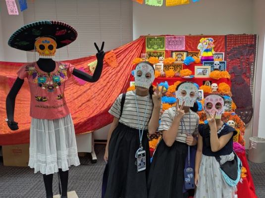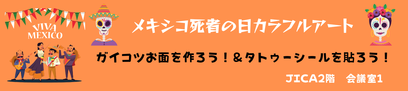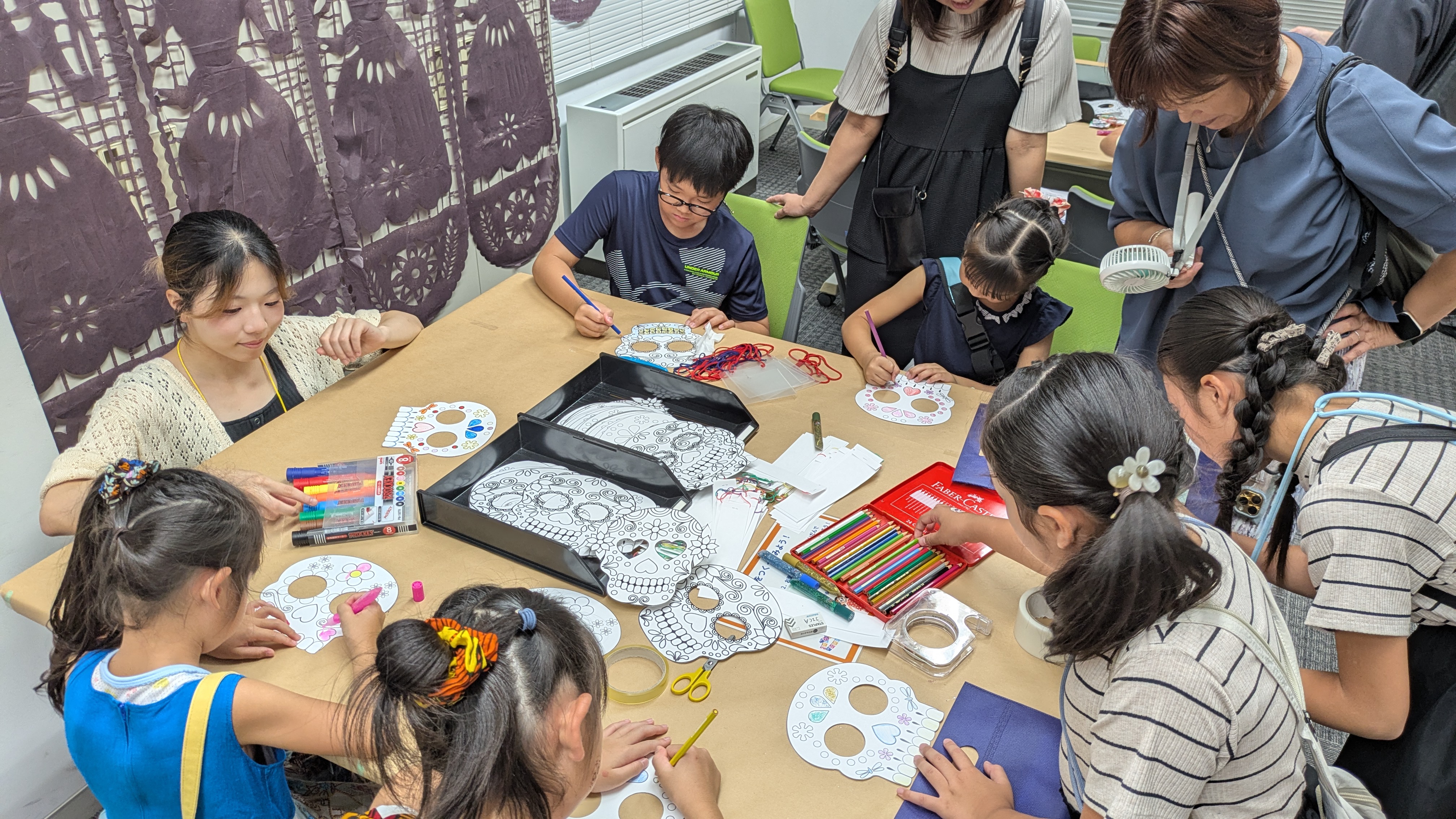 メキシコ死者の日カラフルアートのブースでは、たくさんの参加者にガイコツのお面作りやタトゥーシールを楽しんでいただきました。イベント開会早々から閉会まで終始参加者が途切れることなく、皆さん笑顔で楽しまれながら最後には祭壇で写真を撮っていました。子どもだけでなく、大人まで夢中になることができたカラフルアートでは、「メキシコのお祭りについても学ぶことができた!」という感想もあり、ただの体験にとどまらず、メキシコ文化への関心が自然と芽生える場となりました。