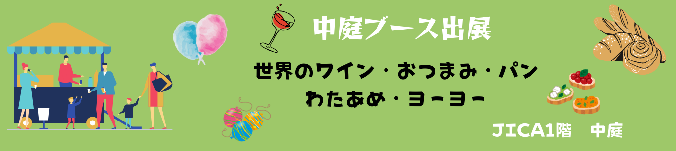 今年は16団体にご協力いただき、開発途上国のハンドメイド雑貨やフェアトレード商品等の販売、SDGsパネル展示、チャリティネイル、子どもと楽しめるアートやゲームなど様々なブースを出展いただきました。商品の購入がどのように途上国の支援に繋がるのか熱心に話を聞いている若い子たちの姿がありました。中庭ではJICA海外協力隊OBの方々の協力により途上国を応援するチャリティパンの販売、各国のワインを楽しめるブースの出店もあり、食を通じて世界を感じるきっかけになりました。子どもから大人まで楽しめる様々な出展にたくさんの笑顔が溢れました。