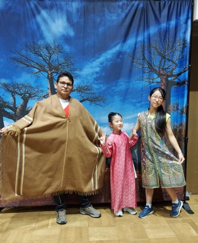 会場に約30か国の民族衣装を展示し、参加者はお気に入りの衣装を選んで試着。JICA研修員と一緒に、海外の風景を背景に記念撮影を楽しむ姿が見られました。大人も子どもも笑顔いっぱいで、まるで世界旅行をしているようなひとときでした。