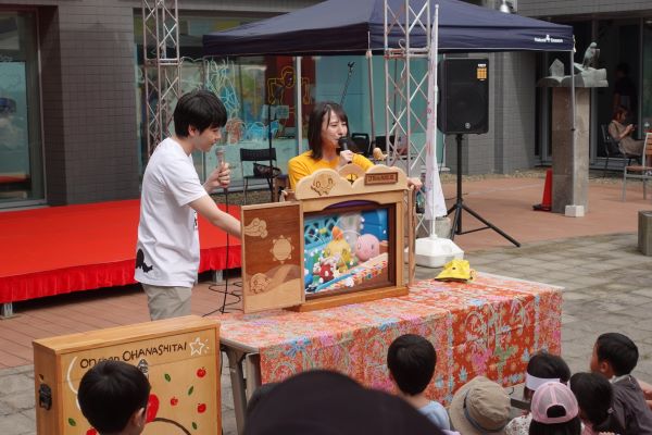 大勢の子どもたちが集まったのは、HTBアナウンス部で結成された、「onちゃん おはなし隊」による紙芝居。福永裕梨アナウンサーと藤澤達弥アナウンサーの読み聞かせに、子どもたちはくぎ付けでした。最後はみんなで「onちゃんおはようたいそう」をonちゃんと共にしました!