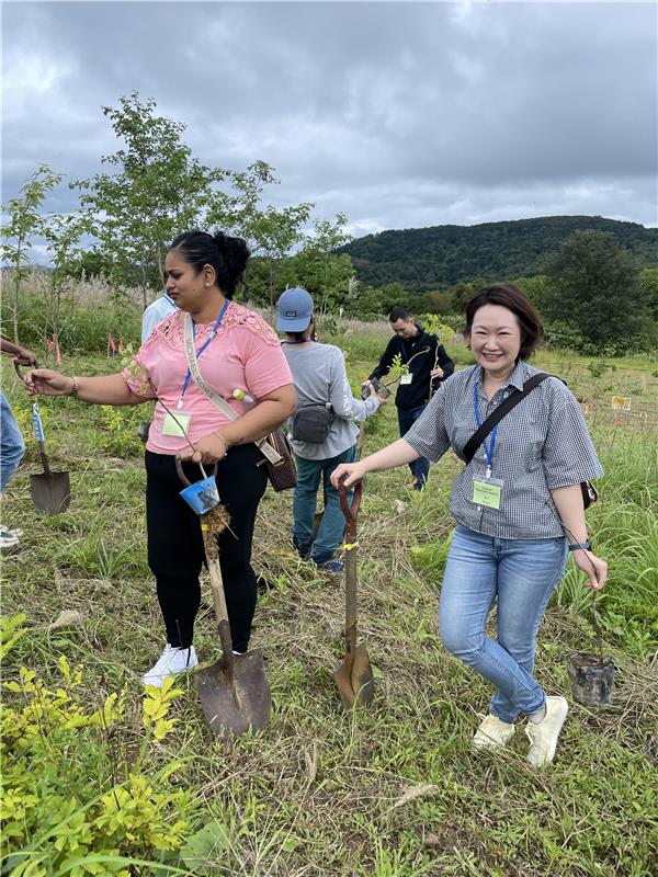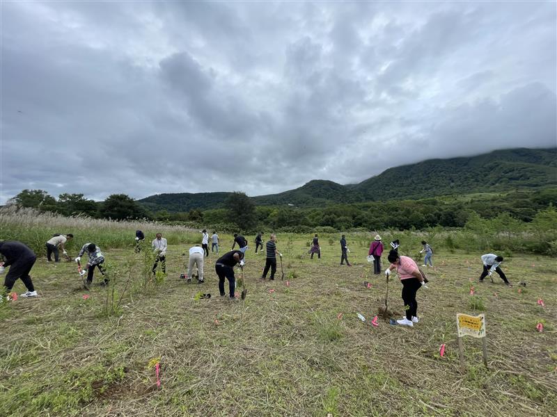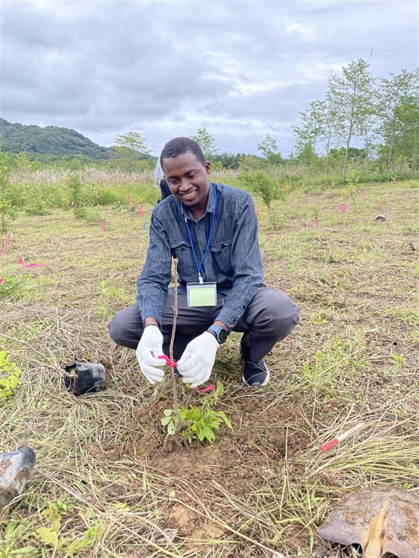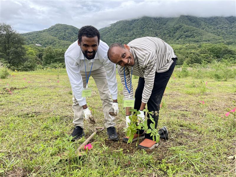 木工体験が終了したところで、いよいよ「道民の森」の中へ!そこでは、2つ目の実習「植樹体験」を行いました。事前にこの日のために用意されていたアオダモの苗を1人1本ずつ植樹したのですが、アオダモは地域の天然の木で、シカやウサギなどに荒らされないようなタイプの木という点で選ばれたようです。留学生の中には「一生に一度の体験だ」と感激する人も多くみられました。