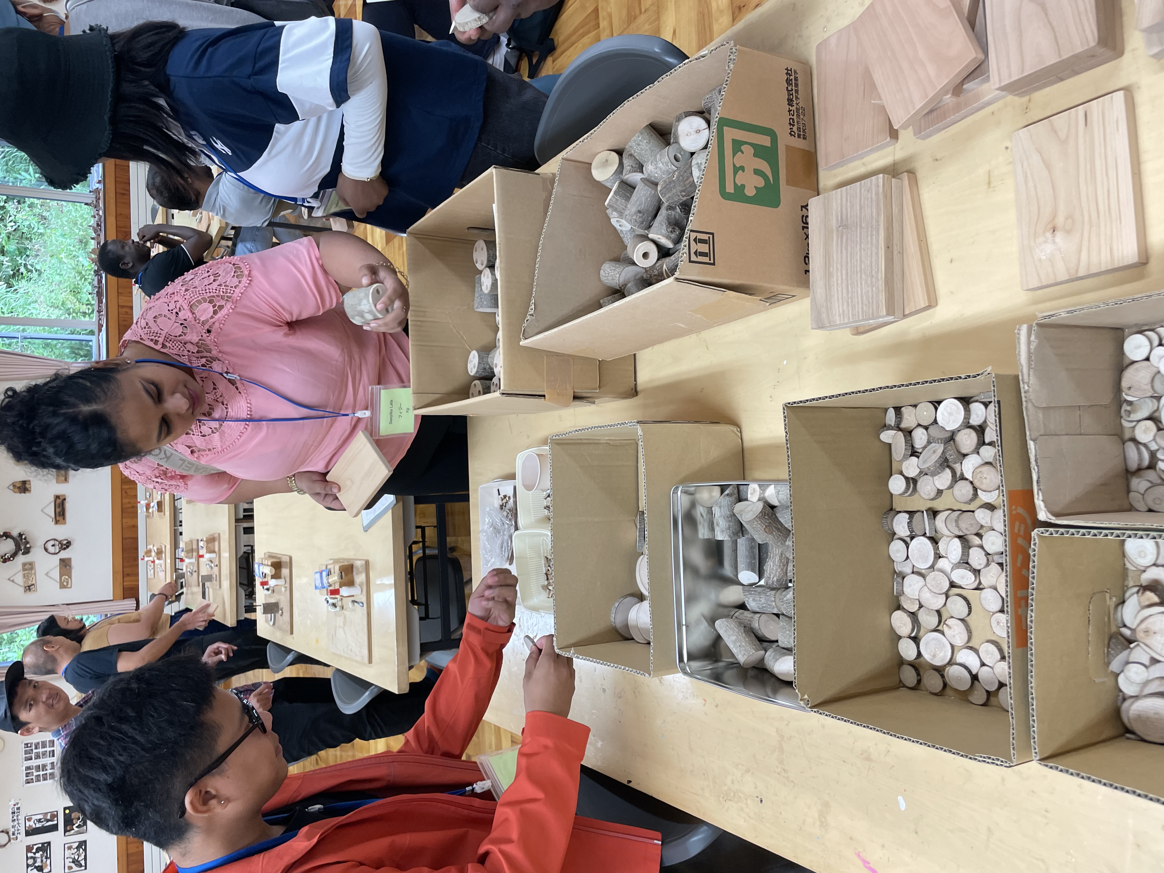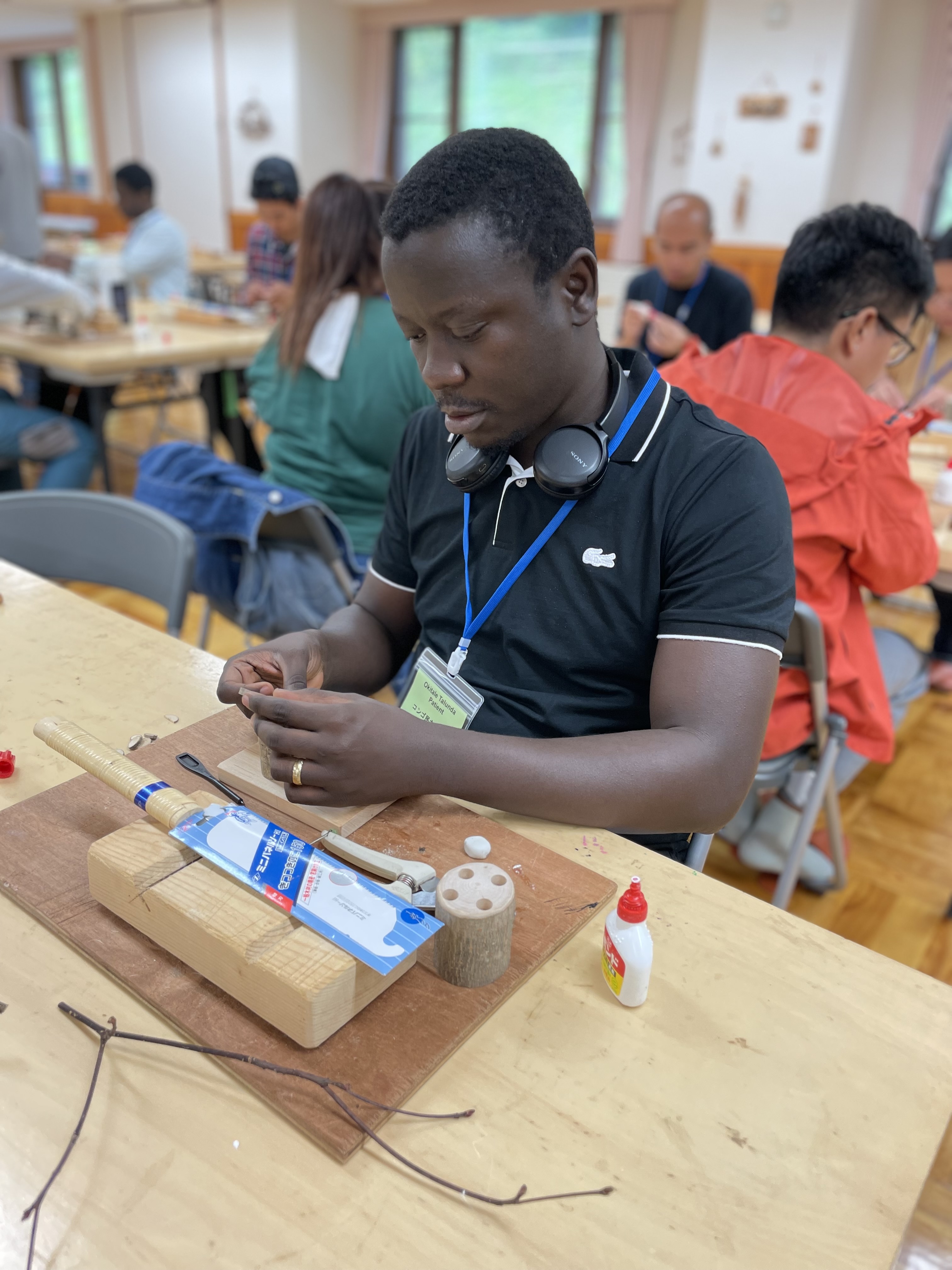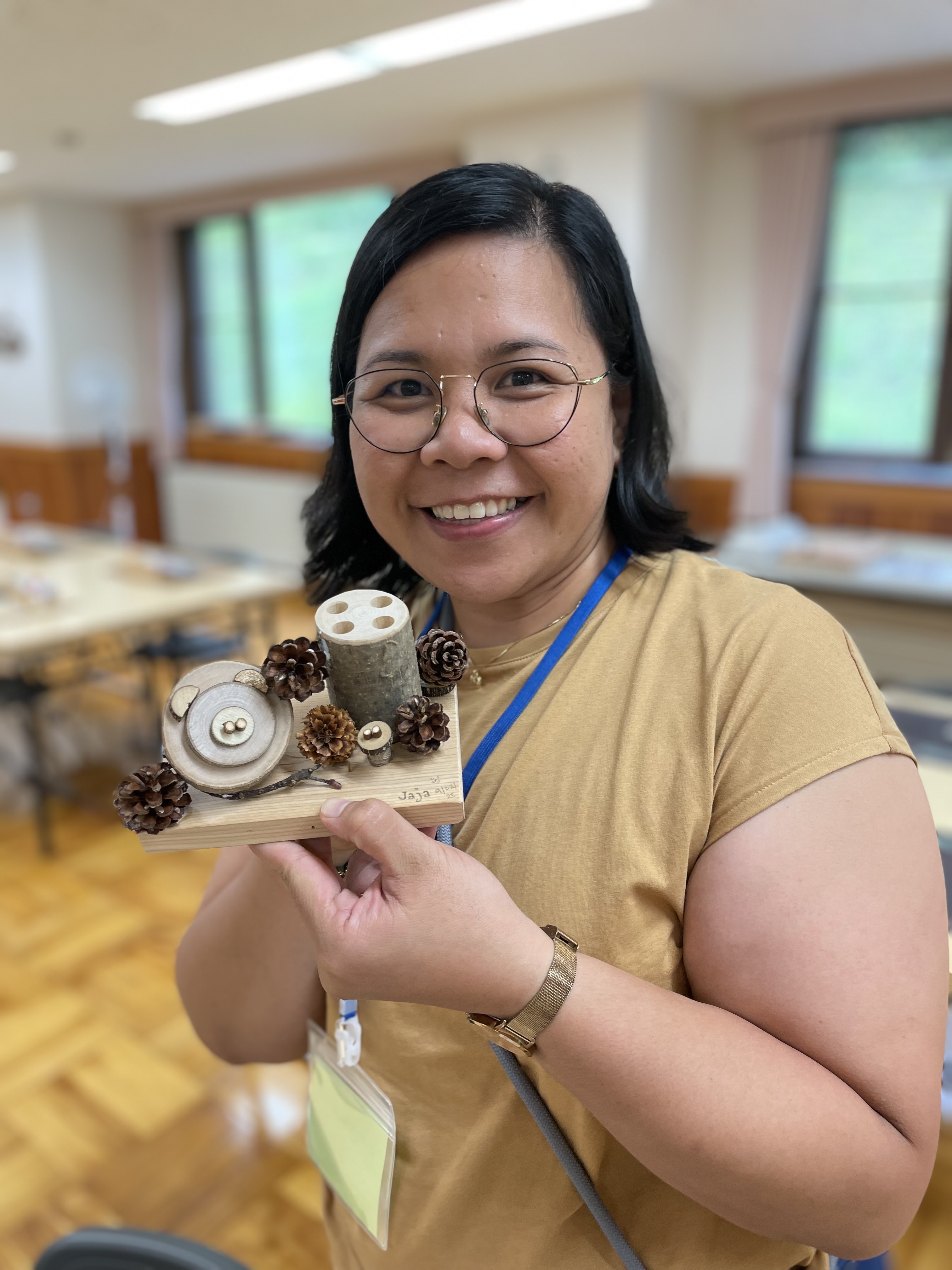 まずは、伐材を用いた木工体験です。みなさん、限られた材料のなかから、松ぼっくりやどんぐりなどを飾り付け、思い思いに個性的な作品を作成していました。中には、細い枝を器用に使って文字を形作る留学生もいました。