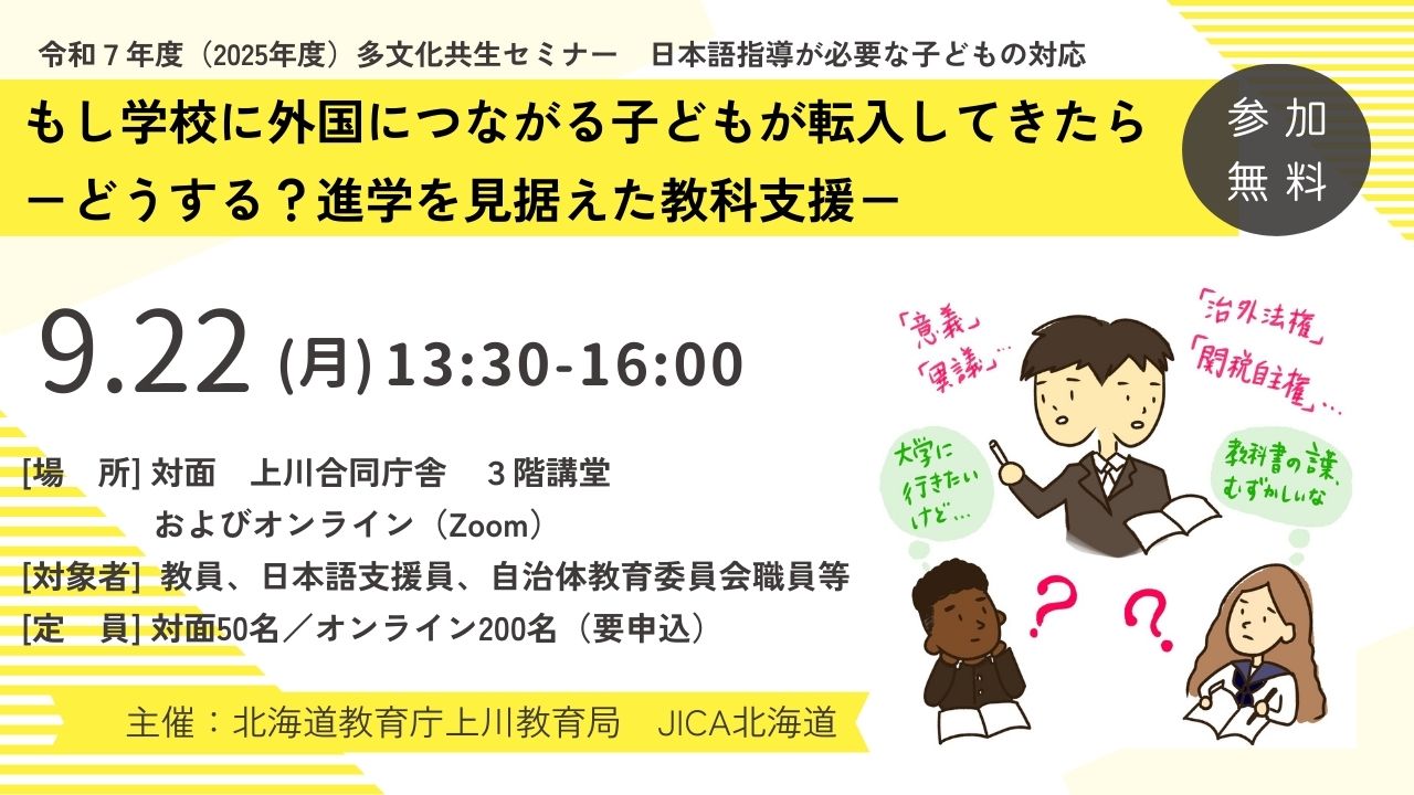 9月22日(月)、上川合同庁舎およびオンライン(Zoom)にて多文化共生セミナー「もし学校につながる子どもが転入してきたら」ーどうする?進学を見据えた教科支援ーを開催しました。