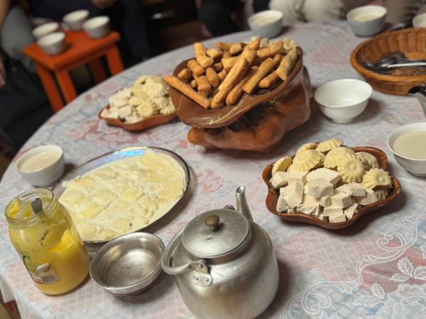 ・ゲル体験(酪農家)、ゲルの中で昼食(アーロール、ウルム、ボルソック)
