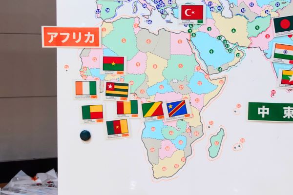 まずは司会の方から外国人参加者の紹介。JICA研修員はそれぞれの現地語で「こんにちは!」と挨拶をし、世界地図に自国の国旗マグネットを貼りました。地図を見ると、アフリカの中でも西の地域にある国が多かったことがわかります。JICA研修員以外では、フランス、スウェーデン、フィンランド、トルコ、カナダ、インド、バングラデシュ、中国、タイ、ミャンマー、ネパール出身の参加者がおり、全部で19カ国もの外国人参加者が集いました。