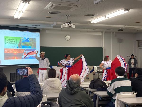 11月11日には北翔大学にて学生、教職員及び一般市民を対象に「自然と平和を愛する国コスタリカ」と題して、コスタリカの歴史や自然、エネルギー政策等について3名が講義を行いました。講義の最後にはこの日のために練習してきた伝統舞踊を披露してくれました。華やかで迫力のあるパフォーマンスに皆魅了されていました。