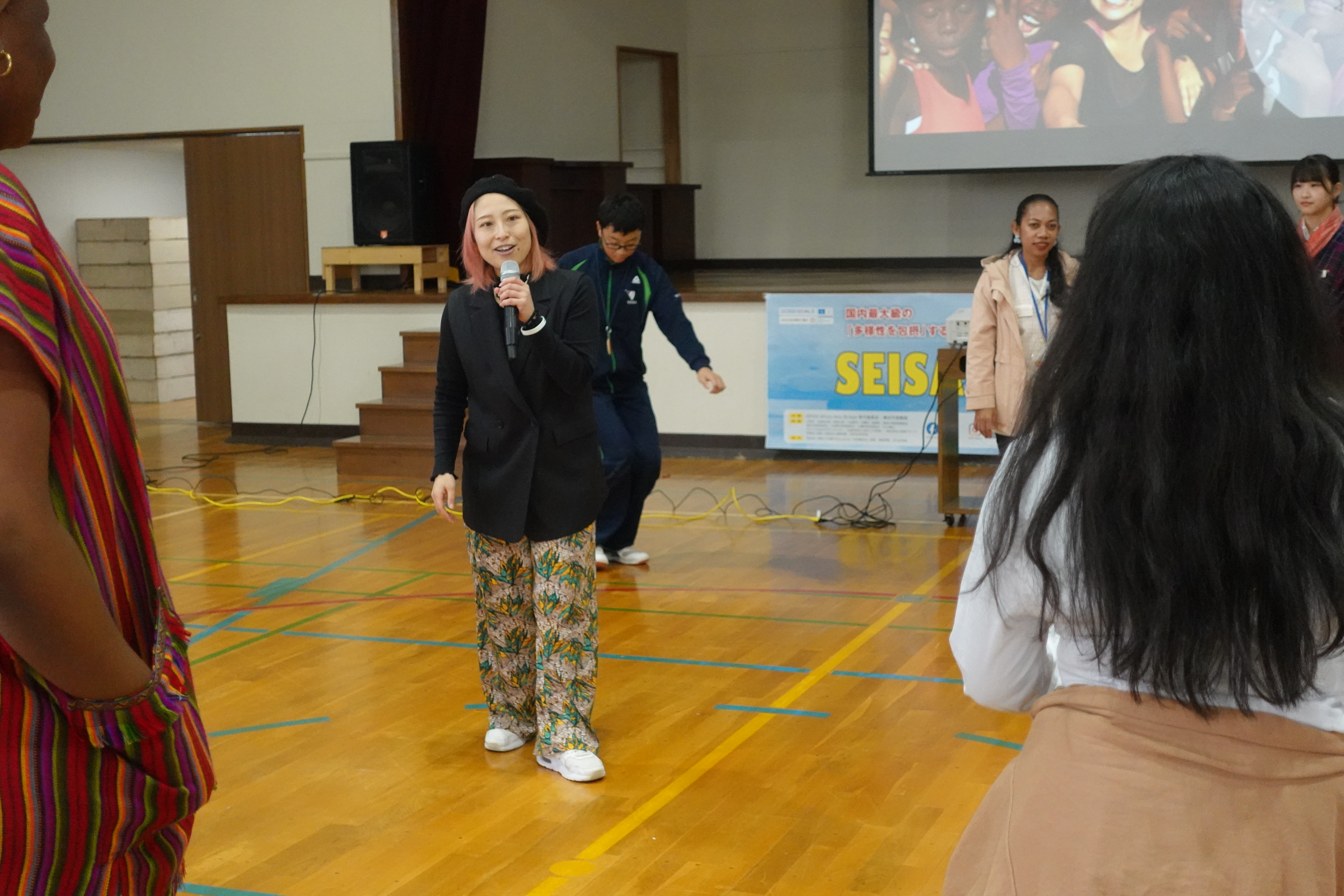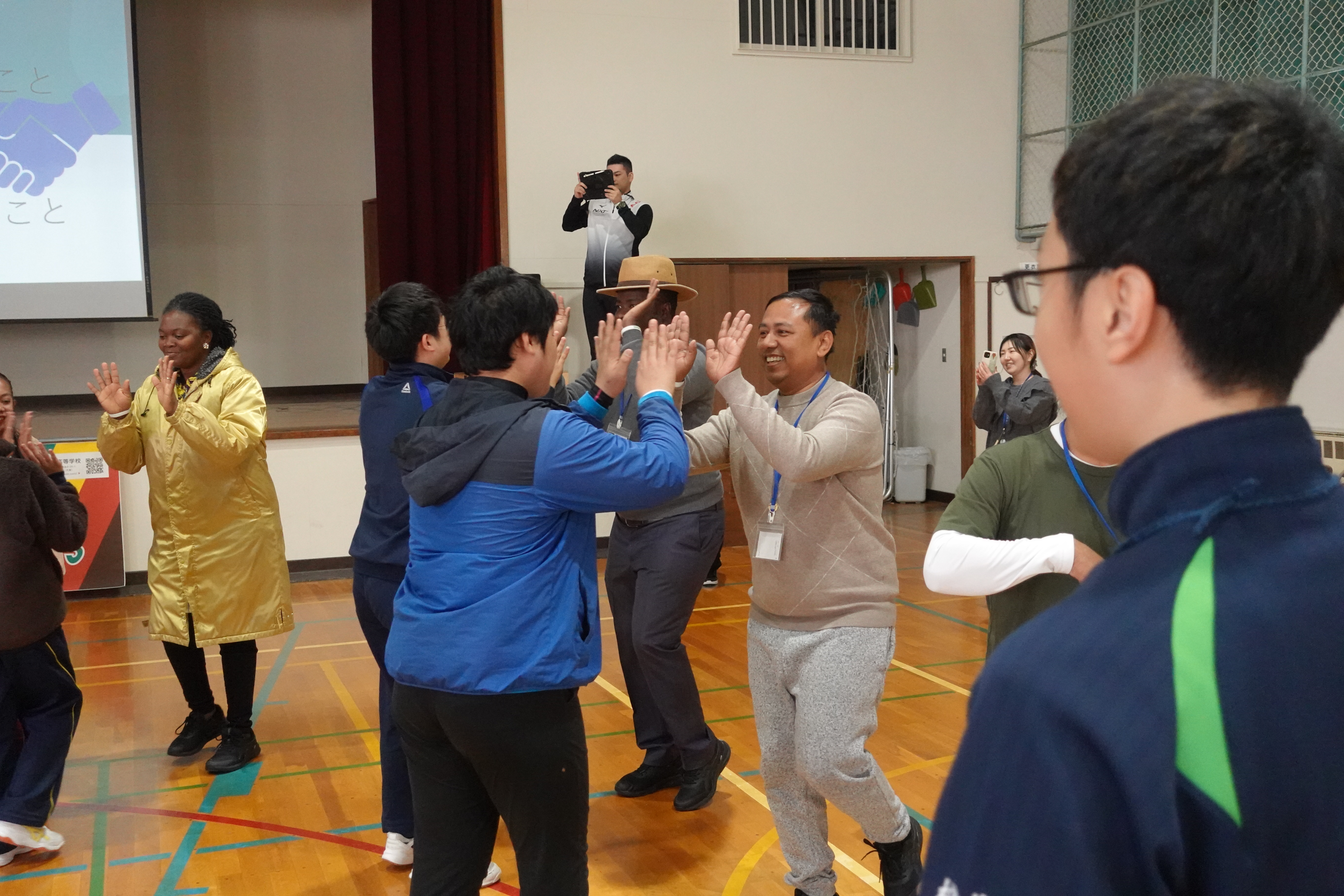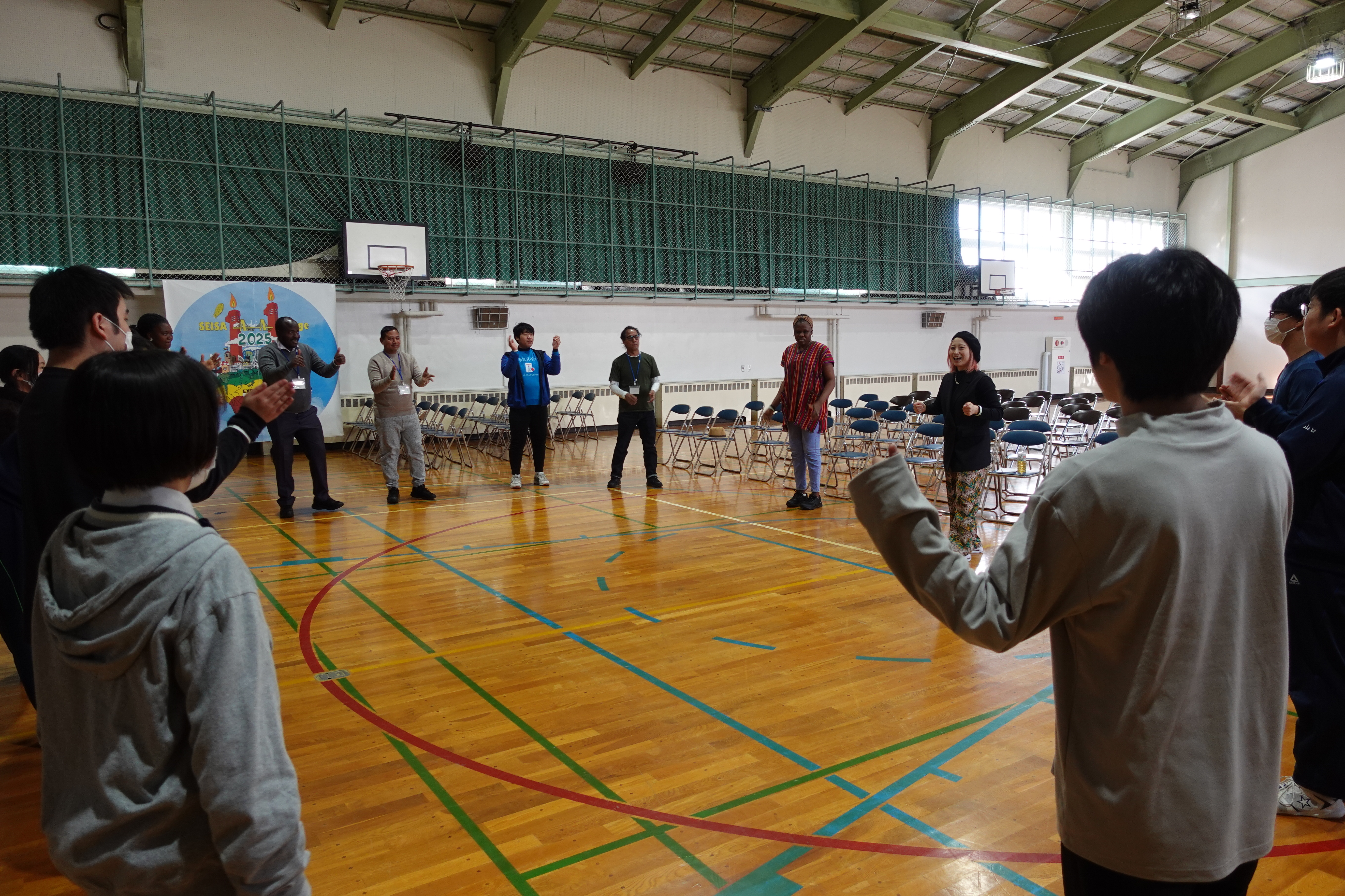 札幌市にある星槎もみじキャンパスでは、生徒向けの様々なワークショップが行われました。訪問した研修員は、JICA海外協力隊でザンビアのメへバ難民キャンプに派遣されていた鈴木未央さんによる「アフロダンス」のワークショップに参加し、生徒の皆さんとダンスを通して交流をしました。