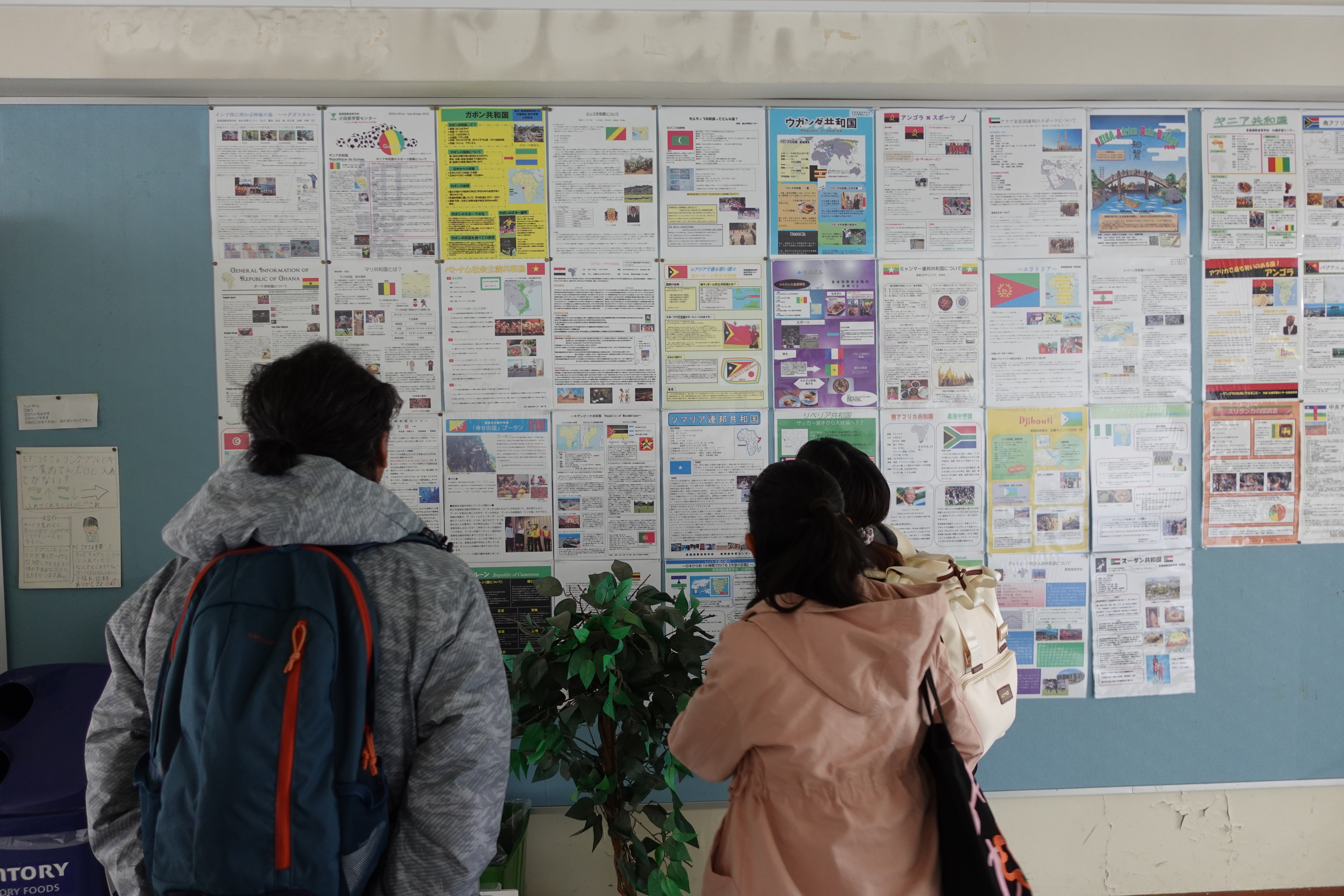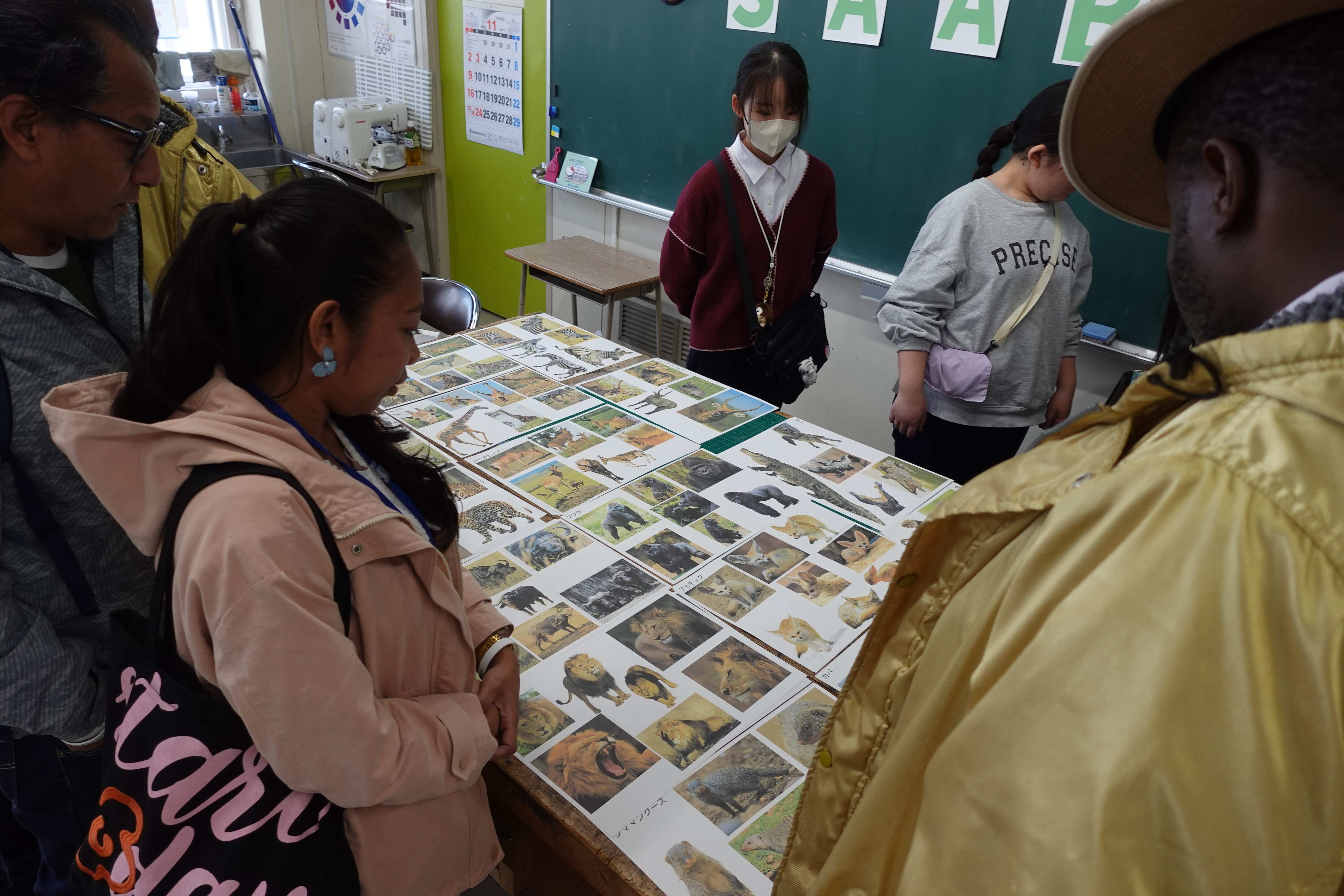 ワークショップの前には、先生に学校内を案内していただき、午前中に行われていたその他のワークショップを見学。美術室では、紙粘土で動物を作って動物園を作ろうというプログラムが行われており、研修員たちは、動物たちの写真を見ながら自国にいる動物について話をしていました。その他、学校内の掲示物や、学校制服など、日本の学校生活の様々なものに興味を示している様子でした。