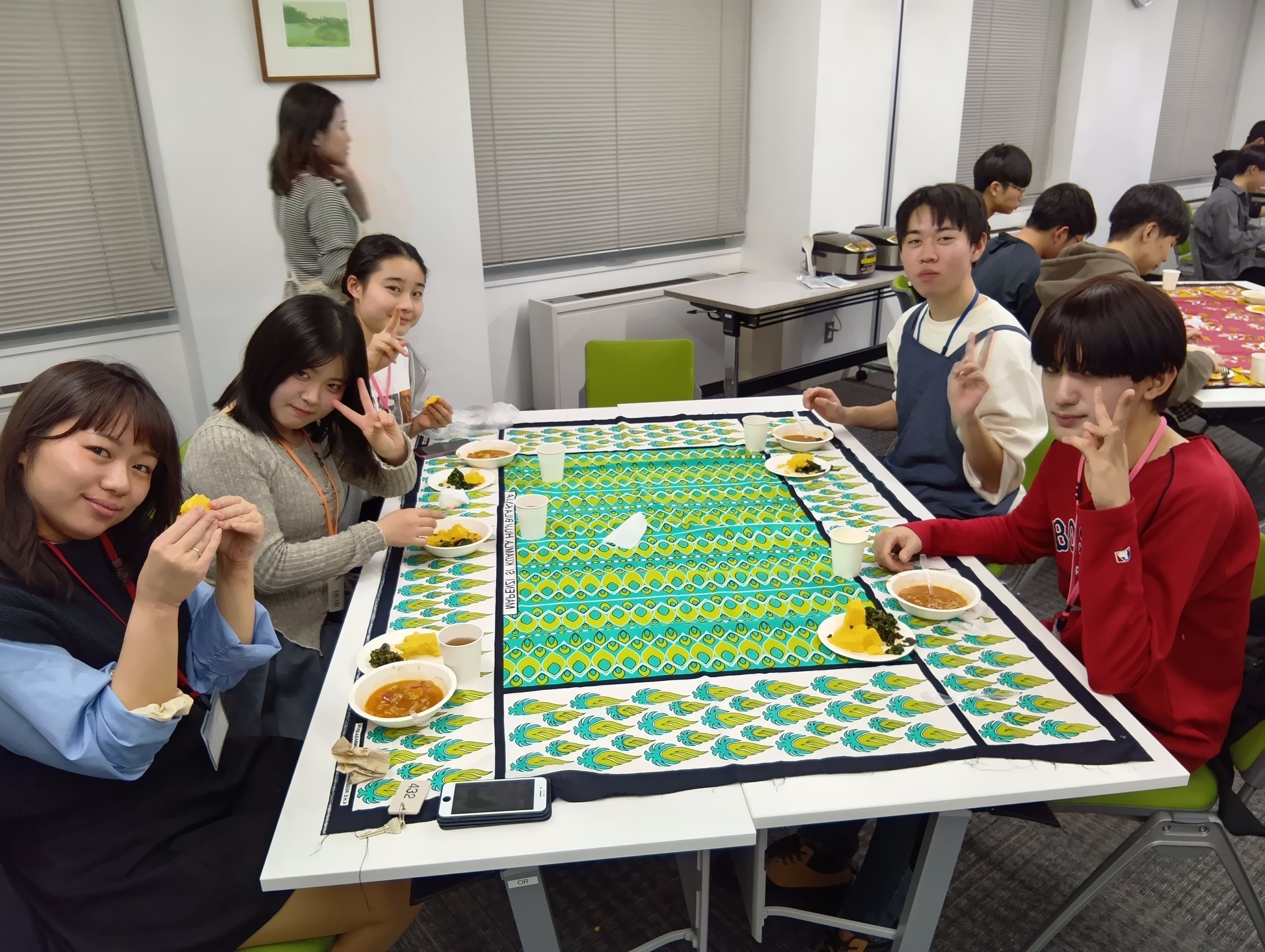 完成後は、現地の食文化にならい、ウガリを手で丸めておかずをすくいながら実食。油を多く使うケニア料理の特徴も含め、味と慣習を体感する機会となりました。ウガリが口に合わない参加者を想定して、白米も用意していたところ、「やはりご飯が落ち着く」と笑顔で話しながら、カランガとともに白米をおかわりする姿も見られるなど、食を通じた異文化理解を深める時間となりました。