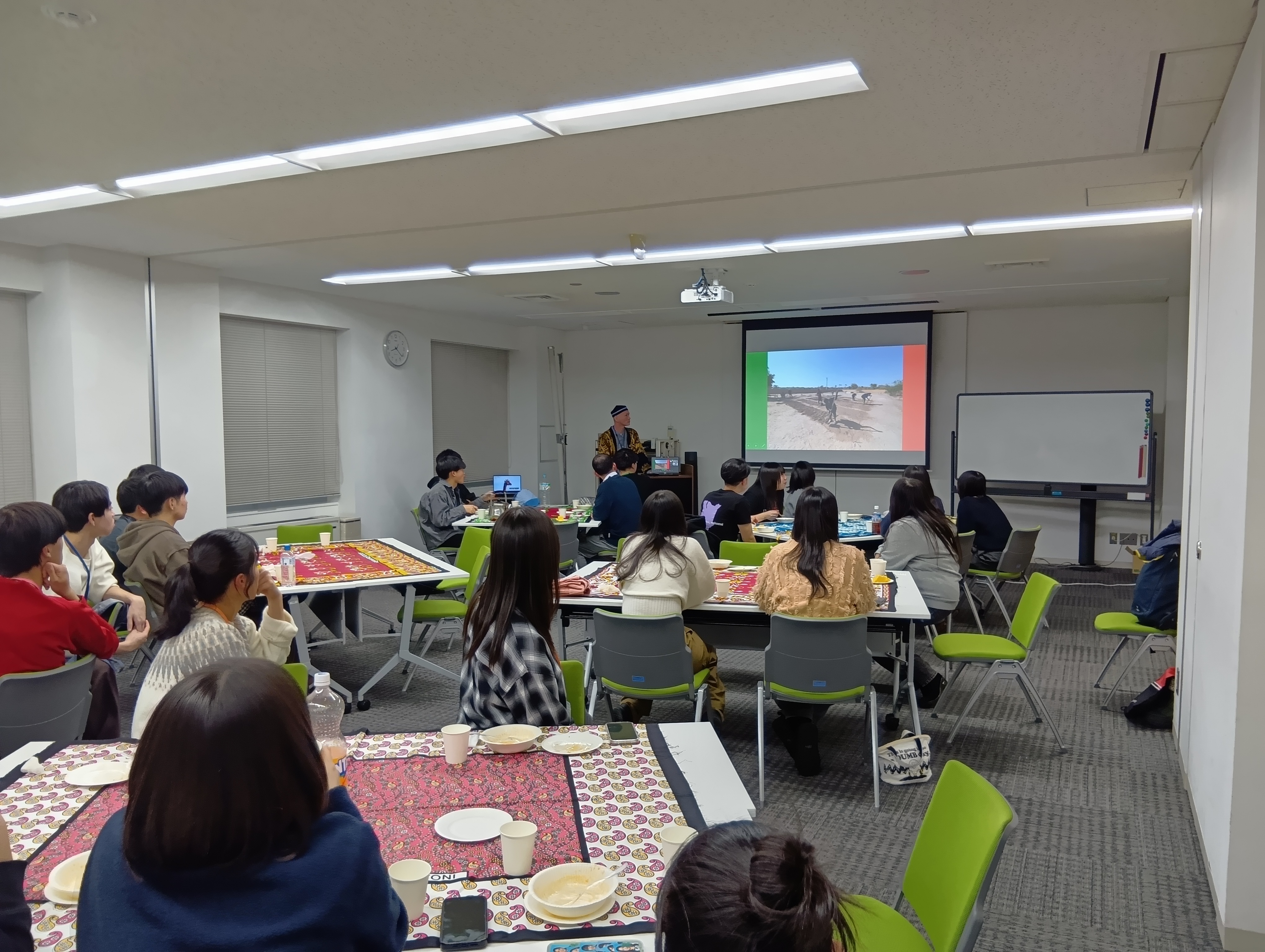 「アッサラーム・アレイコム、ササモリサーン!」と、参加者全員で遠くセネガルに向けて呼びかけます。画面に篠森さんの姿が映し出されると、食事をしながらも参加者の視線はスクリーンに集中しました。