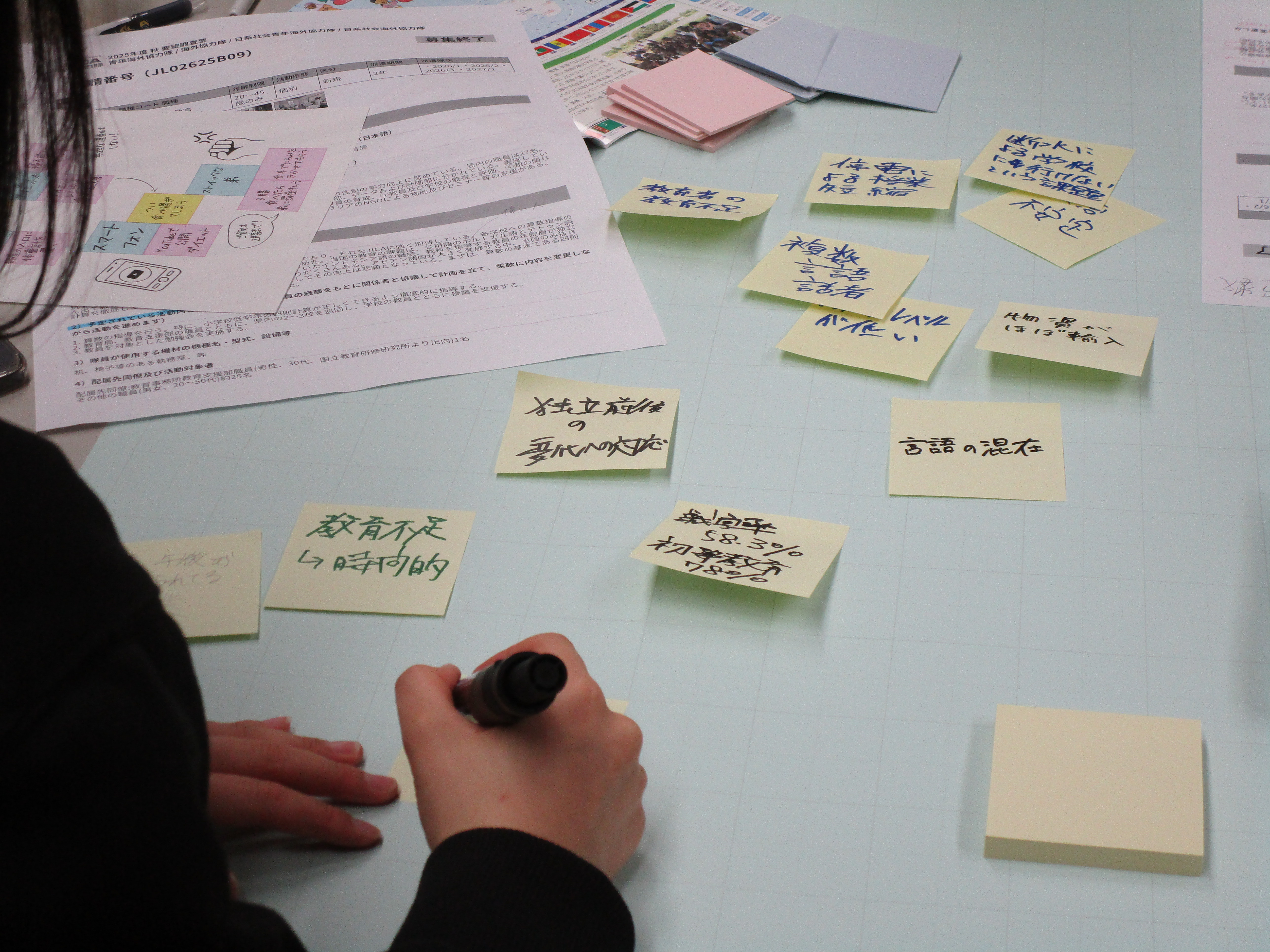 次のフェーズでは、選んだ要請書から課題や目標を整理し、それに対してどのようなアクションが考えられるかを付箋に書き出していきます。すでにワークショップ①「なりきりJICA海外協力隊」を体験していたこともあり、どのグループからも次々とアイデアが生まれていました。