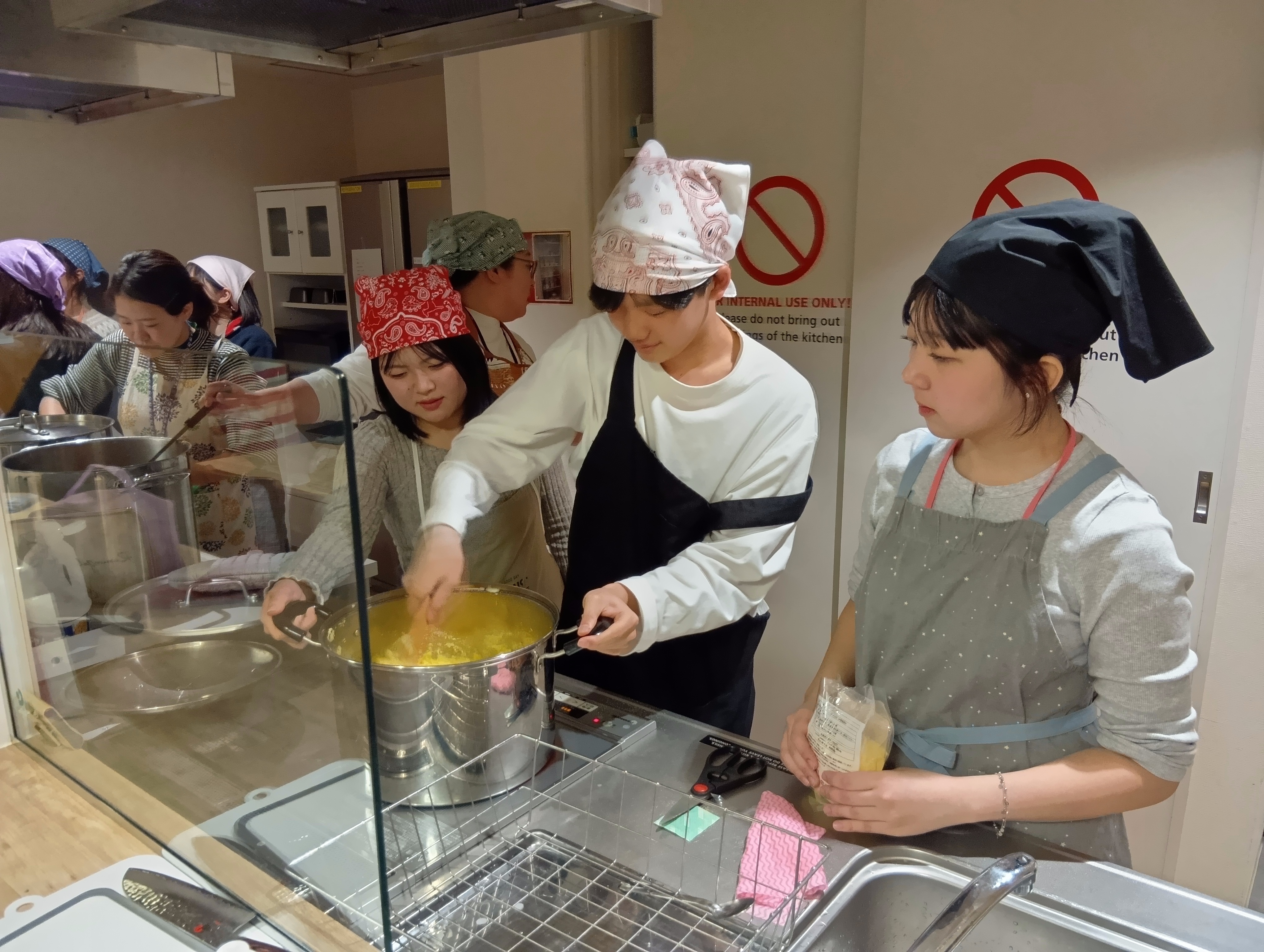 午後のワークショップでケニアについて理解を深めた後、参加者とスタッフが一緒になって夕食作りに取り組みました。メニューは、ケニアの主食であるウガリ、ビーフシチューのカランガ、そしてケール炒めのスクマウィキの3品です。
