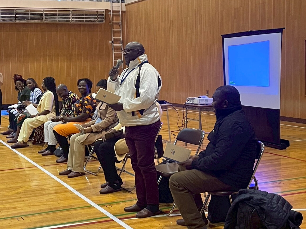 まずは、アンゴラとモザンビークから研修員1名ずつが、自分の国について紹介。今回、1人5分での国紹介を行ったのですが、通訳が必要なため、実際には半分の2分半ほどしか話すことができません。アンゴラの紹介スライドには、「Catatos」という揚げた幼虫で作る料理など、日本との食文化の違いを感じる写真もありましたが、どうしても紹介に熱が入り話が長くなるのがこの異文化交流プログラムあるあるで、食べ物にはあまり触れずに紹介を終了。モザンビークからの研修員はスライド5枚もの準備をしてきましたが、なんと1枚目しか見せずに時間になってしまいました。