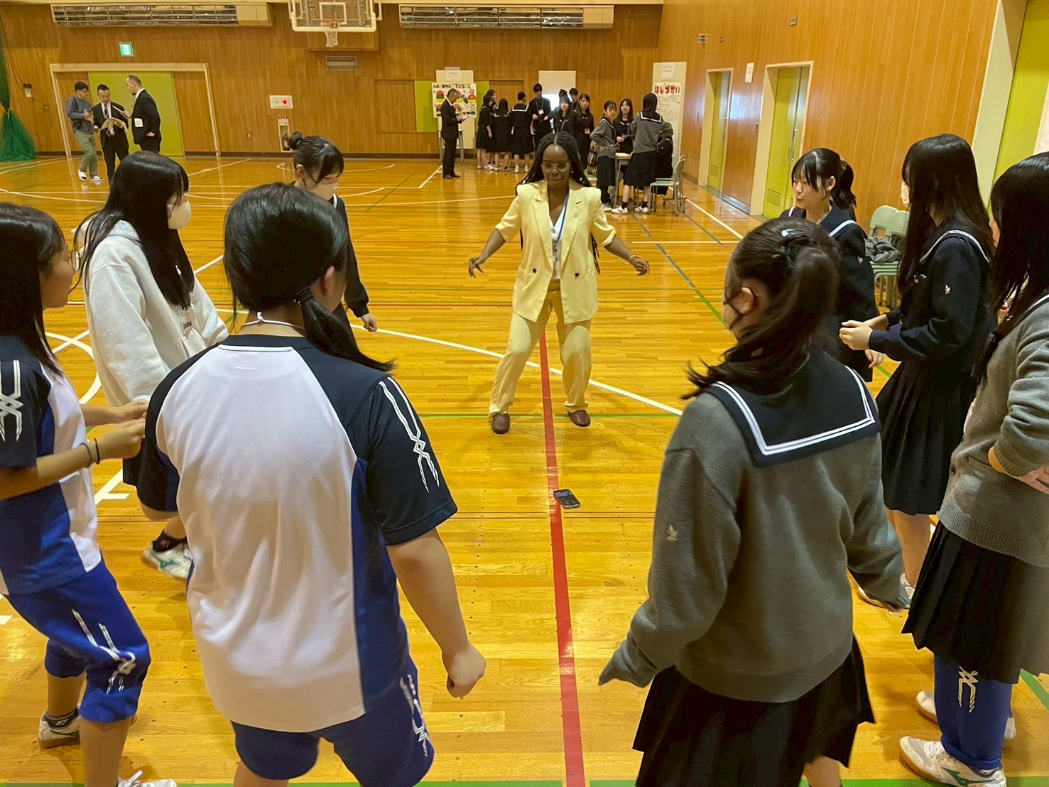 最初の国紹介でダンスを紹介していたアンゴラからの研修員は、YOSAKOIソーランのブースで北海道の踊りを体験した後、アフリカのダンスのステップを教え、生徒の皆さんと一緒に盛り上がっていました。