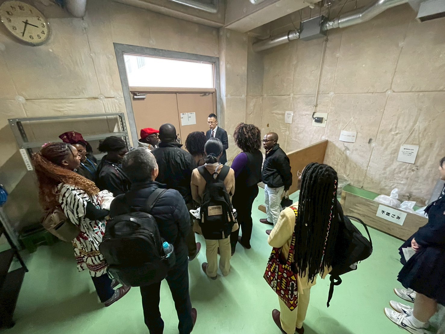 生徒の皆さんとの交流の後、生徒の皆さんが体育館の清掃を行う様子、ゴミの分別方法、学校内のすべてのゴミが集まる場所などを紹介していただきました。海外では、自分たちで校舎の清掃をしない国が多いと聞きます。研修員にとって、高校生自らが掃除をする様子はとても新鮮だったことと思います。
