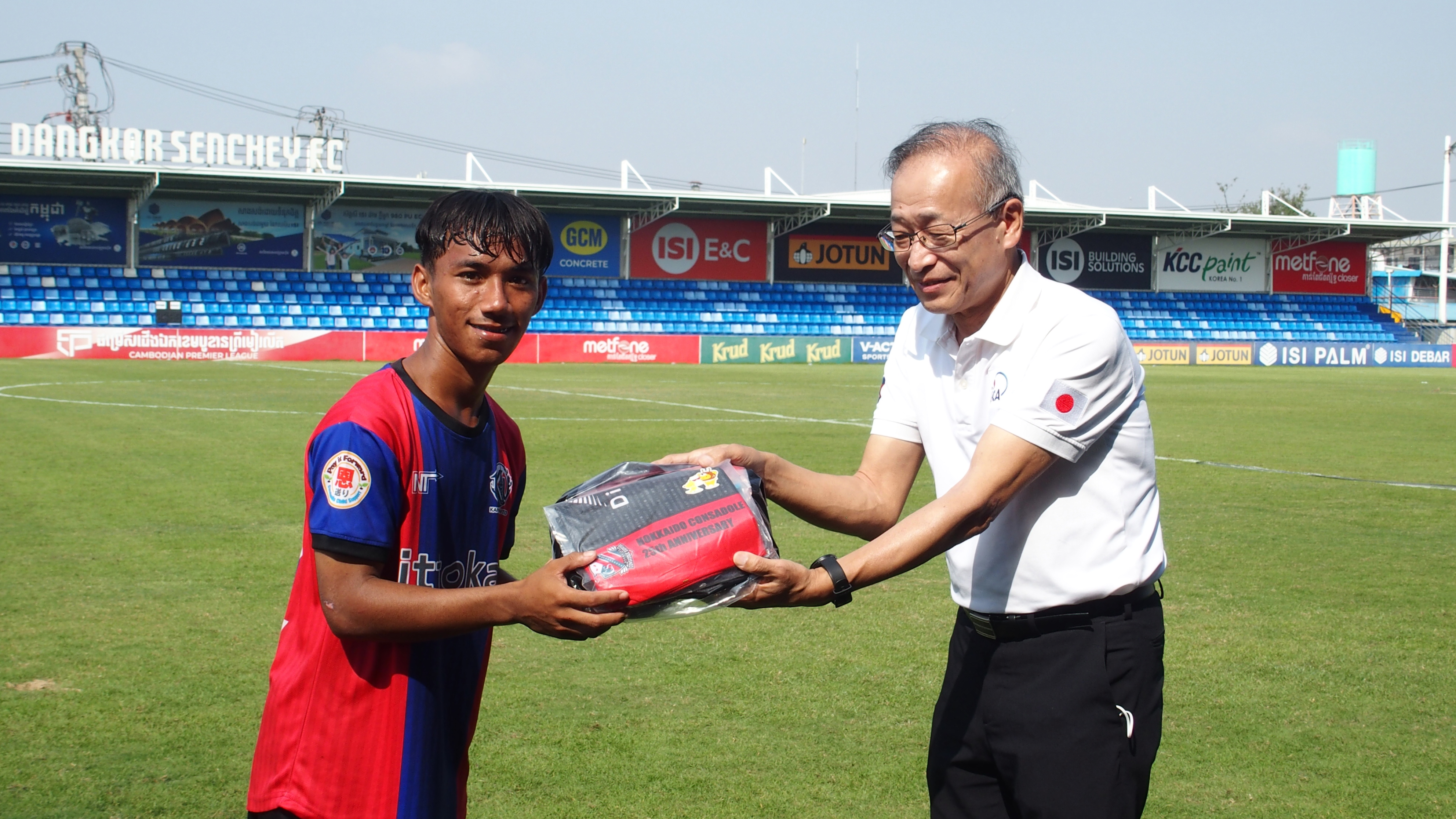 現在、カンボジアにJICA海外協力隊として派遣中の西川和也隊員(品質管理・生産性向上)らがカンダールユナイテッドFC(プノンペン)という現地のサッカーチームを応援するために訪れ、コンサドーレさんから寄贈していただいたユニフォームを、同チームの選手たちに手渡しました。