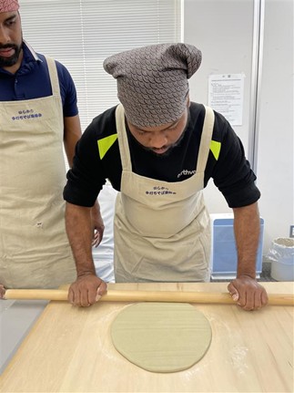 講師によるそば打ちの模範演技から体験はスタート。講師の巧みな手さばきに、研修員からは驚きと歓声が上がり、日本の伝統技術への関心が高まる様子がうかがえました。その後、参加者は4グループに分かれ、粉を混ぜる工程である“水回し”から生地をまとめ、伸ばし、切るところまで、そば作りを体験しました。どの研修員も集中して作業を進めていました。特に印象的だったのは、研修員の作業の上手さです。講師も「初めてとは思えないほど上手」と驚くほどでした。