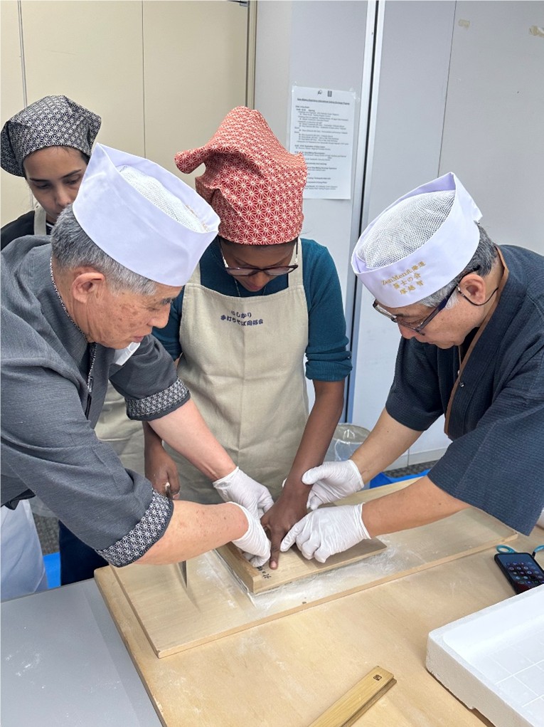 研修員は、講師の丁寧な指導を受け、粉の状態からそばを打ち上げるまでの一連の工程を体験しました。初めて触れる日本の食文化に、参加者は終始興味深そうに取り組み、本格的なそば作りの奥深さを実感している様子でした。