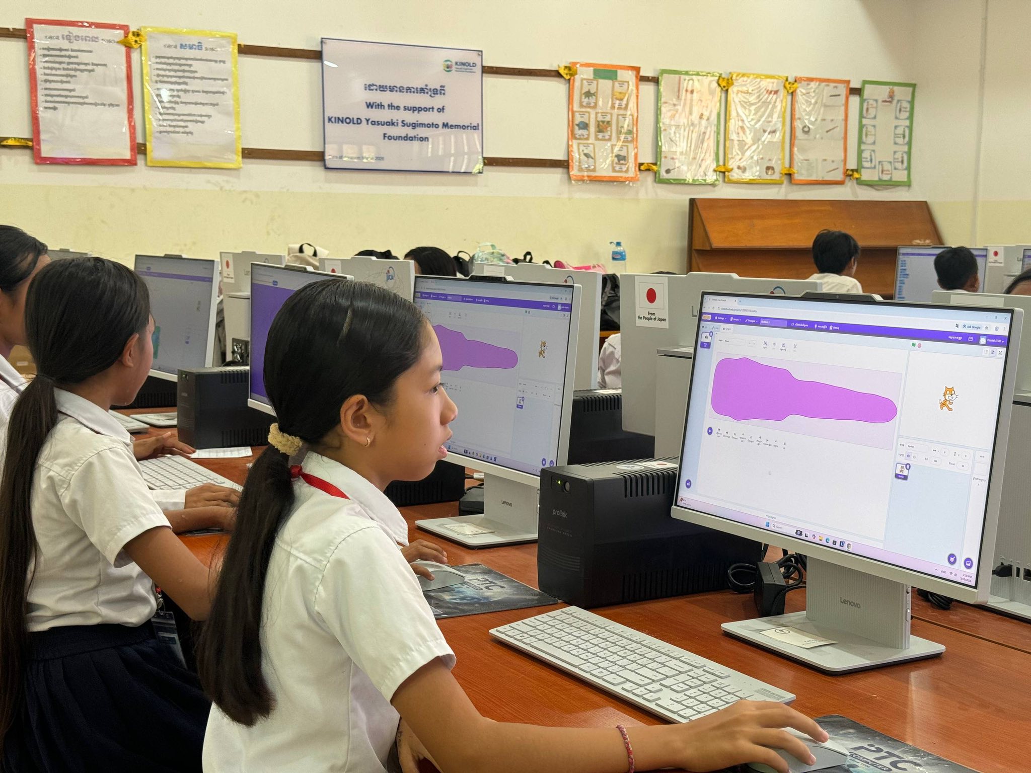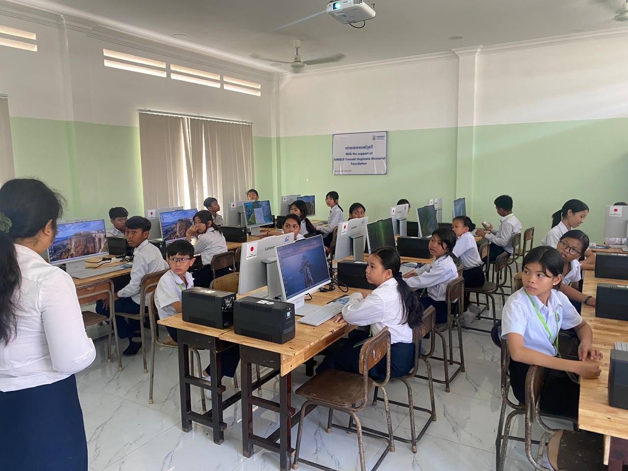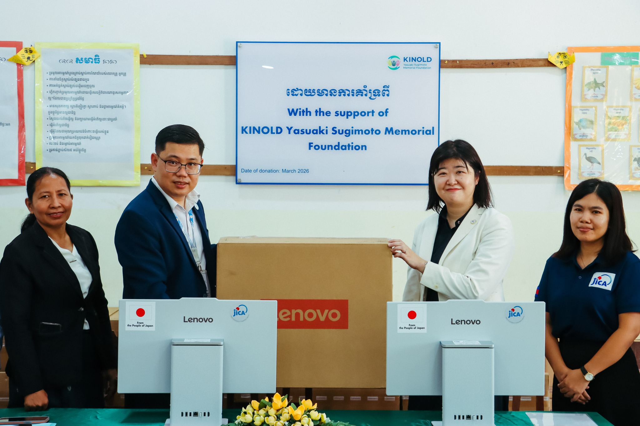 開発途上国の子供たちの、教育や医療の改善を通して、世界の安定と平和を目指す活動を行っておられるキノルド杉本惠昭記念財団(札幌市)から、2025年度に約830万円のご寄附を頂きました。この寄附金を、JICAが実施するカンボジアの教員養成大学の指導実践能力強化支援のために活用させていただき、プノンペン教員養成大学(PTEC)とバッタンバン教員養成大学(BTEC)の各附属小学校にパソコン23台、計46台を寄贈させていただきました。