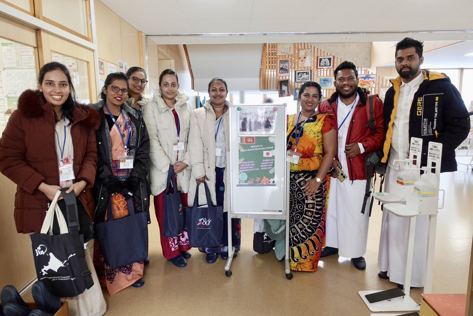 様々な国々から来日中のJICA研修員(以下、研修員)等が、学校を訪問し、児童・生徒と交流する「異文化交流プログラム」。2月10日、今年度の最後は江別市立江別第一小学校でした。訪問したのは研修コース「高齢者支援・介護(介護人材の育成)A」、スリランカからの研修員8名です。