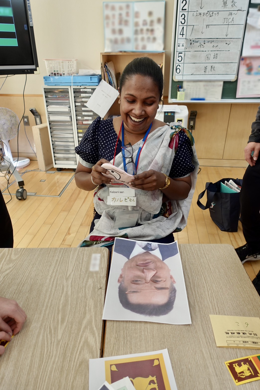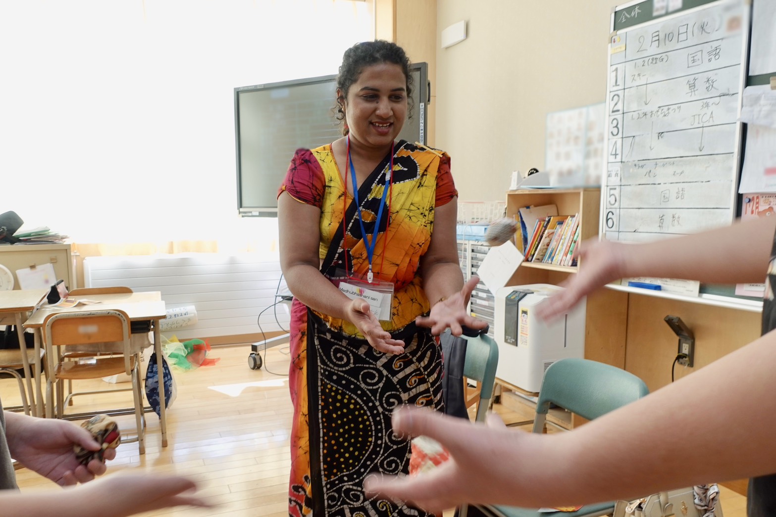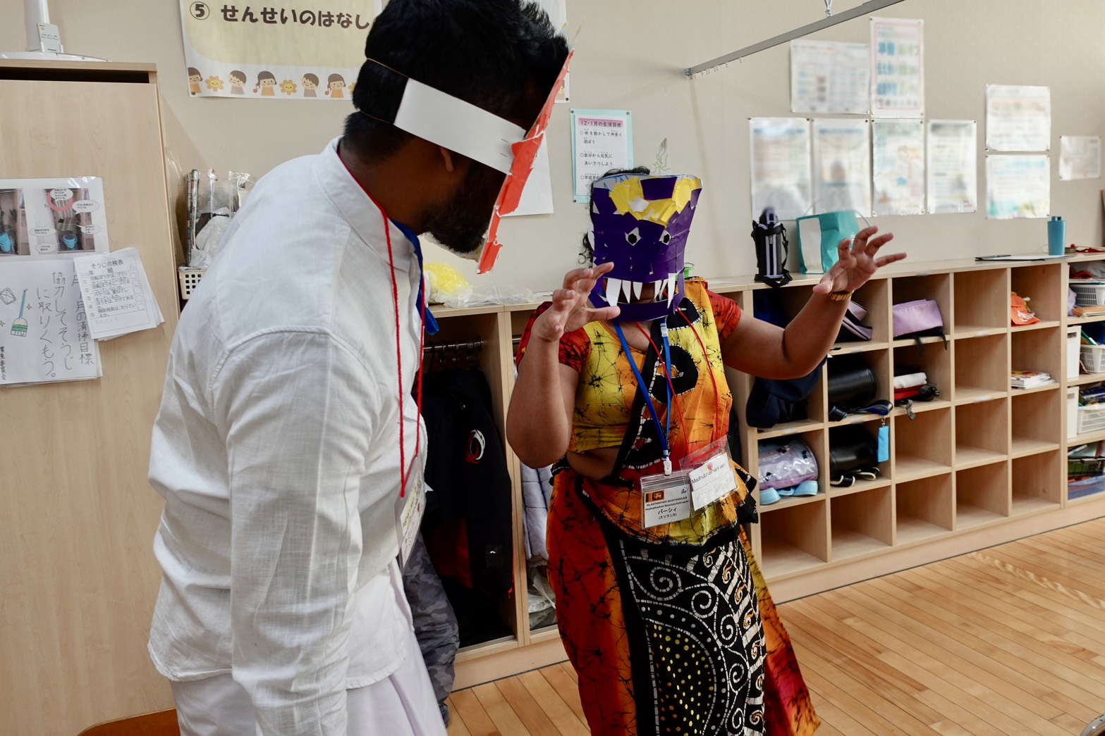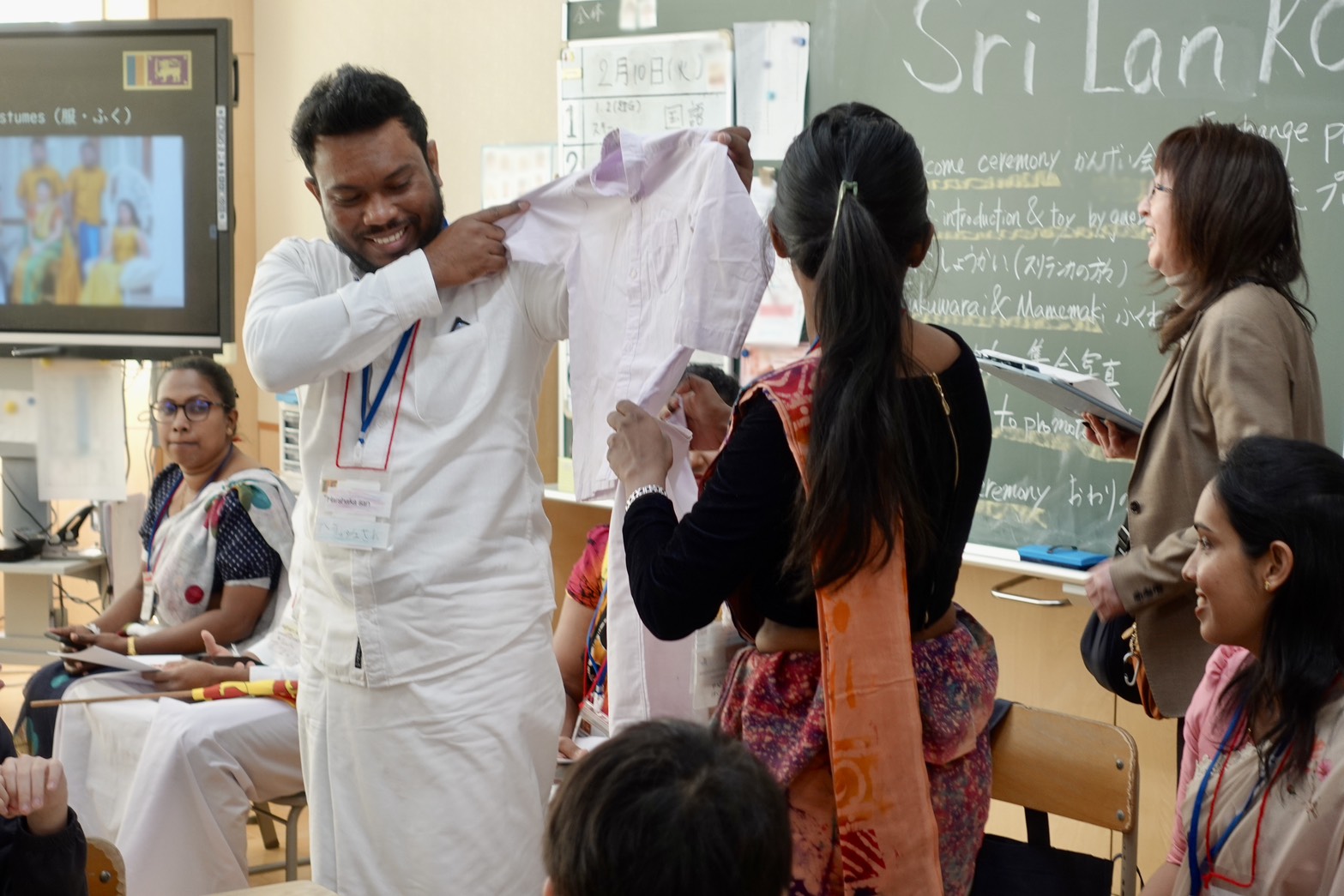 交流プログラムの最初は、研修員の自己紹介です。来日してから学んだ日本語で簡単な自己紹介、そして、スリランカのオススメしたいものを一つずつ紹介しました。スリランカの南部にある要塞都市で世界遺産になっている「ゴール・フォート」、様々な種類がある「スリランカカレー」、煌びやかに装飾されたゾウのパレードが見られる「ペラヘラ祭り」など、研修員一人一人がそれぞれ異なるスリランカの文化を紹介しました。その後は、スリランカのお金や楽器など研修員が持ち寄った物や、子ども用民族衣装体験など、子ども達にとって、スリランカの文化に直に触れる機会になりました。