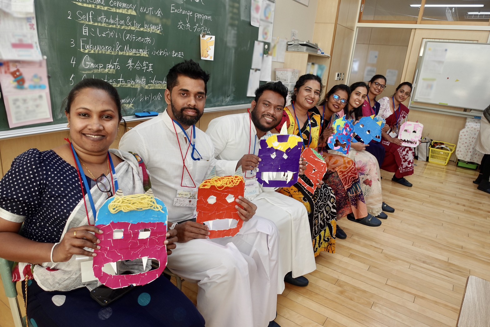 次は、日本文化「福笑い」と「豆まき」の体験です。日本のキャラクターのイラストを使った福笑いが多い中、よく見ると教頭先生の顔写真を使った福笑いがあり、後にご本人登場で教室には笑いが生まれていました。豆まきでは、子ども達手作りの鬼のお面が研修員に手渡され、研修員はしっかりと鬼を演じていました。子ども達は鬼にめがけて、豆代わりのお菓子を投げていました。
