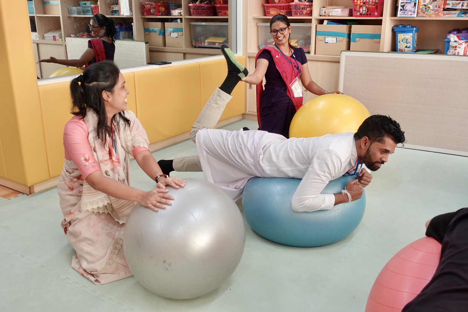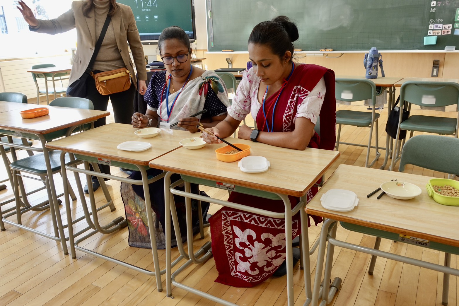 今回交流した子ども達は、江別市立江別第一小学校の特別支援学級に通っています。ここでは、障がいによる学習上又は生活上の困難を、主体的に改善・克服することを目的とした「自立活動」が行われており、今回は普段子ども達が取組む3つの自立活動を一緒に行いました。1つ目はバランスボール、2つ目はお手玉、3つ目は箸を使った豆掴みです。箸を使った豆掴みでは、子ども達と研修員がスピード勝負!スリランカの生活では箸を使いませんが、なんと研修員チームが勝利した回も。遊びを通した自立活動中には自然と笑顔が生まれ、とても楽しい時間となりました。