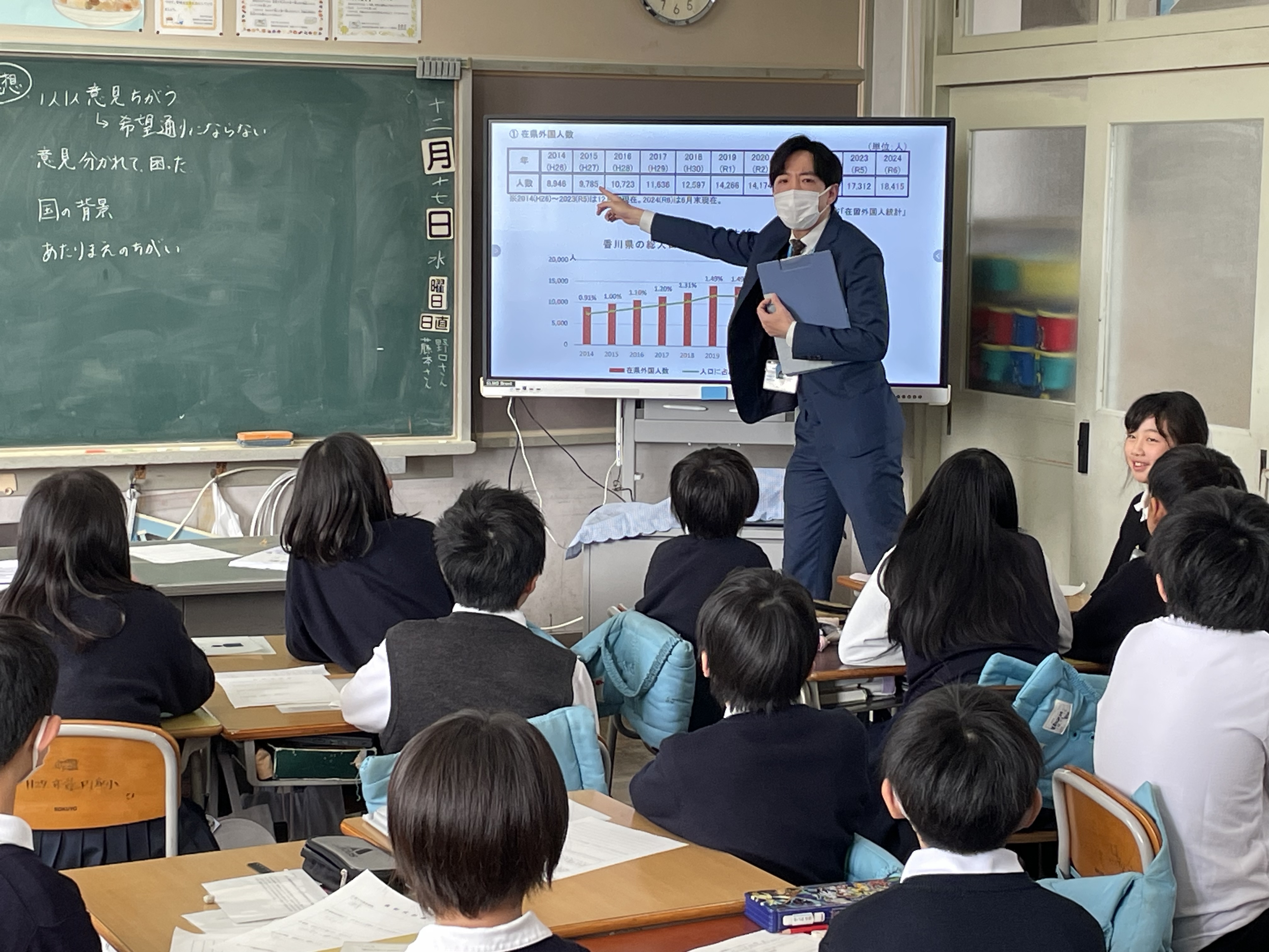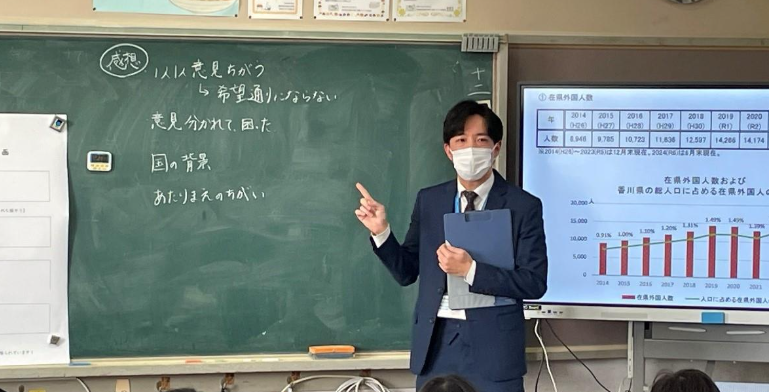 2025年12月17日(水)、香川県高松市立円座小学校の5年生の教室にて、2025年度JICA四国・中国の教師海外研修プログラムに参加した四宮 健先生による実践授業が行われました。