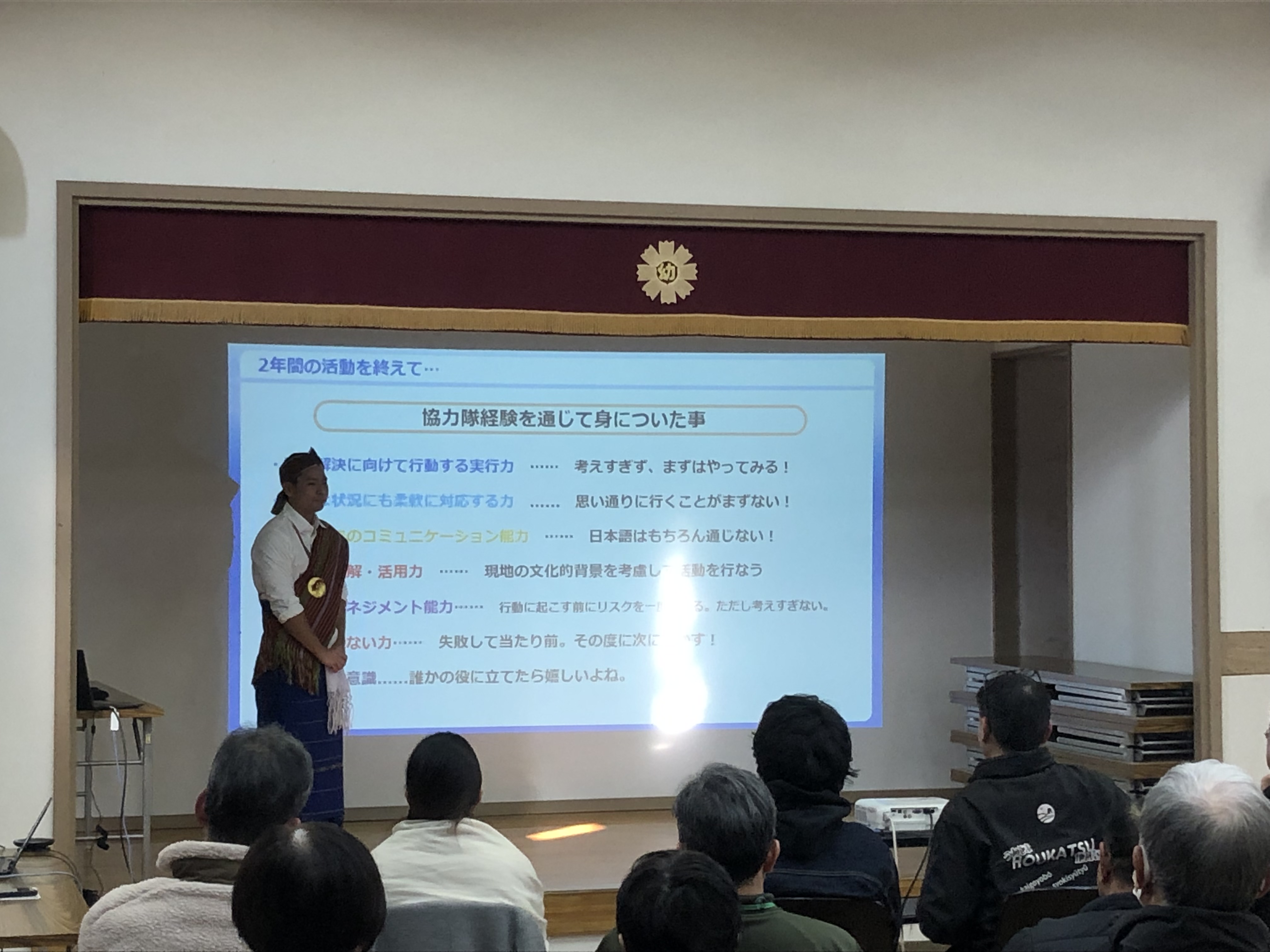 川口さん、前原さんの報告を聞くために帰国報告会には多くの地域住民の方々が集まり、参加者からは、「おかえりなさい」「教育文化の違いがあっても、必要なものは自分たちで作り出していく姿勢がすばらしい」「宇和島市の子どもたちにも良い影響を与えている」「これからも自信を持って前に進んでください」といった心温まる声が届きました。