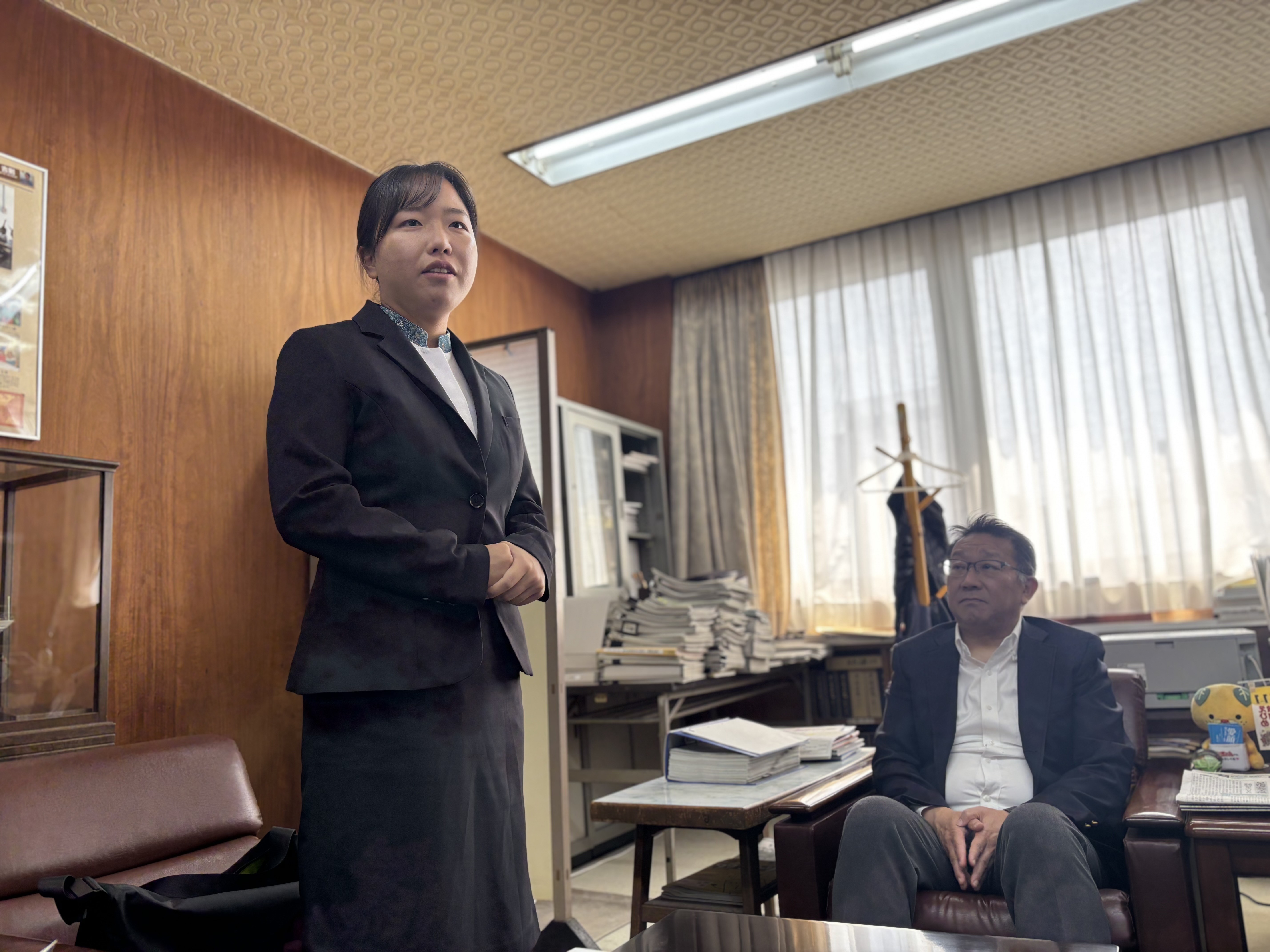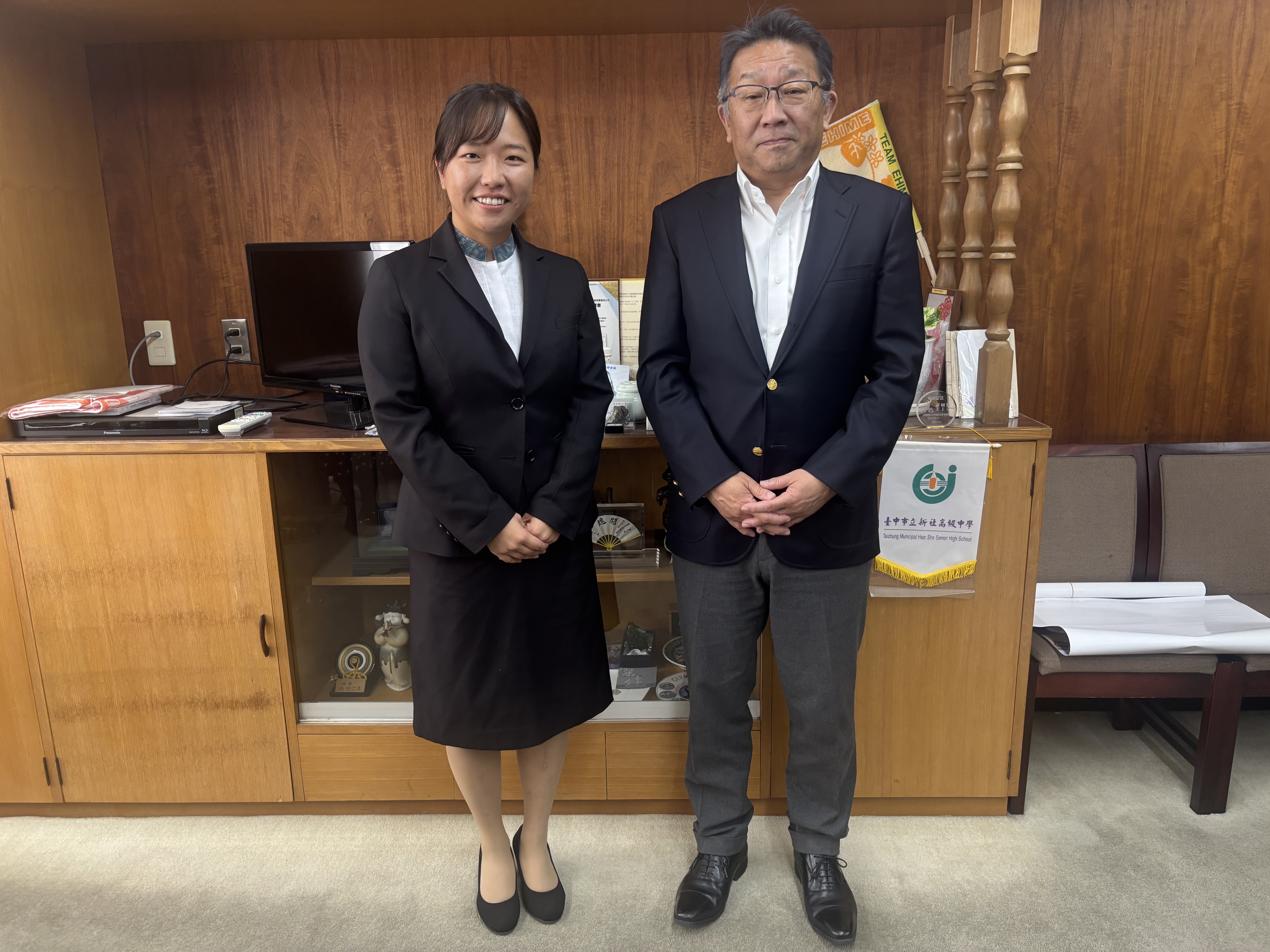 【愛媛県教育委員会にて】井上裕美子さん(左)と髙岡哲也教育長(右)
