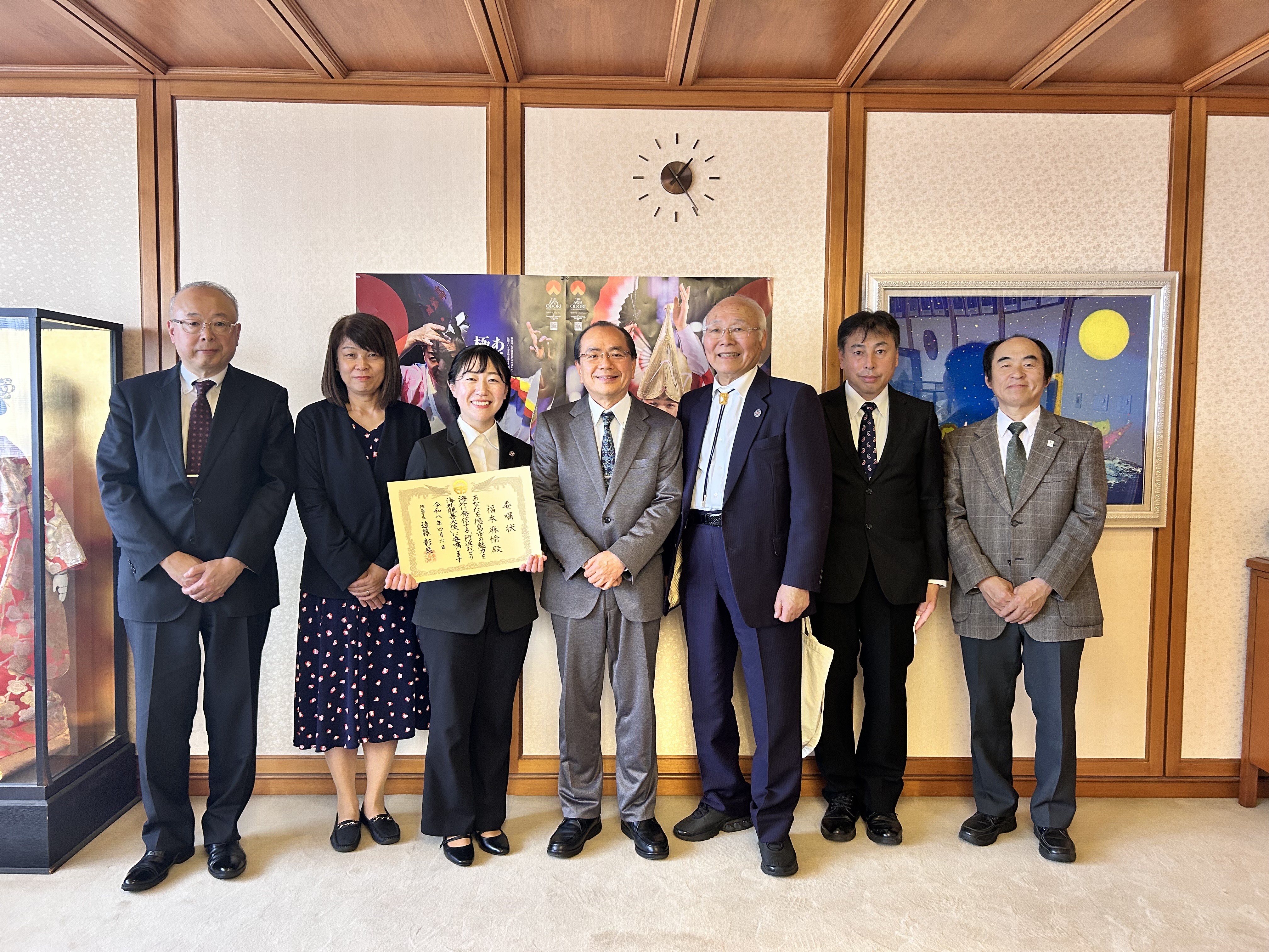 品質管理・生産性向上の職種でコロンビアに派遣される福本麻愉さんは、徳島市役所にて「阿波踊りなどの文化と専門分野である食品との両面で架け橋になってほしい」と激励を受けました。