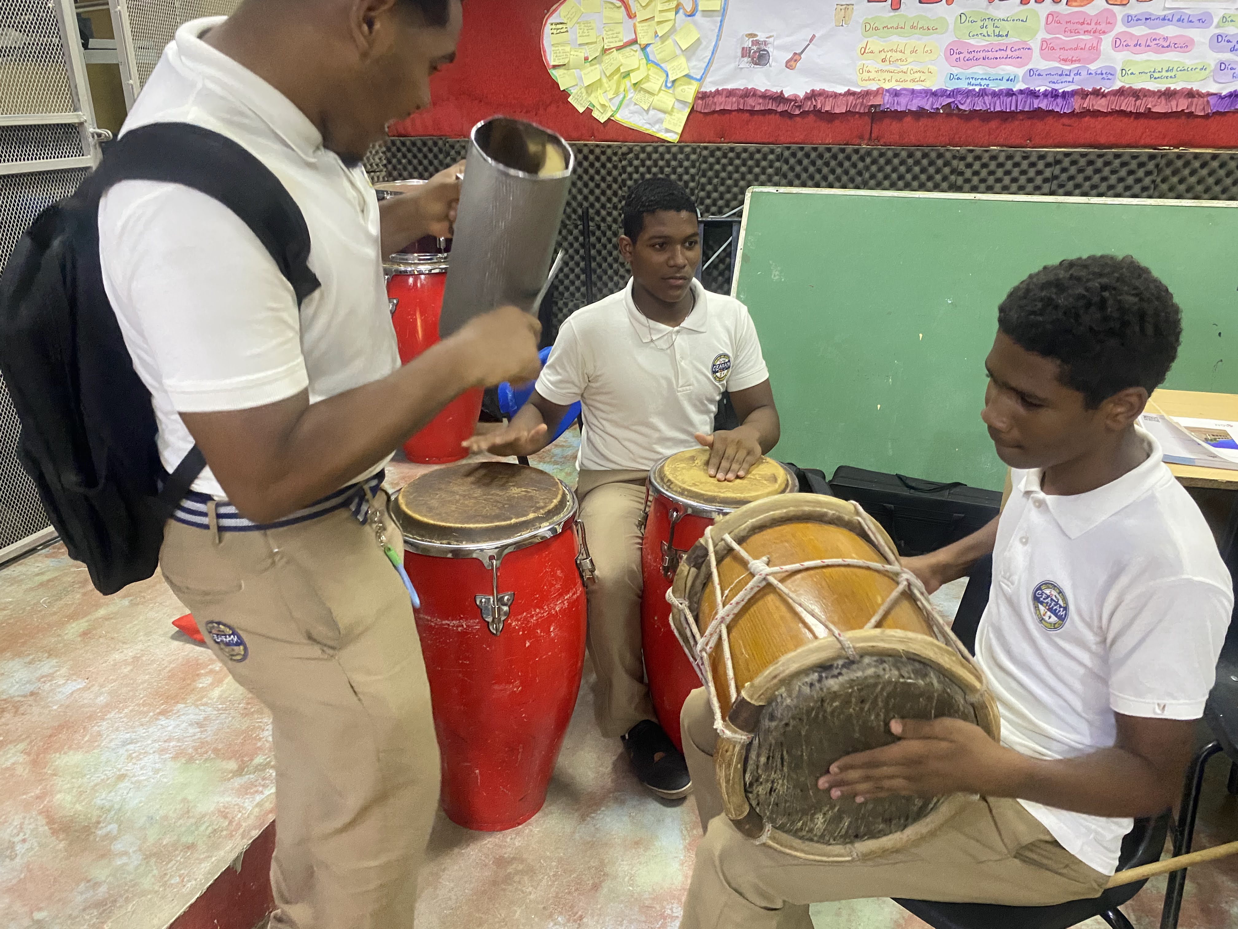 驚くことに、30年以上前の曲でも若者たちに親しまれており、今でもよく演奏されています。時代を超えて、老若男女が同じ曲で歌い踊る姿はとても素敵だと感じます。このように、ドミニカ共和国では音楽とダンスが生活の一部となっており、人々の暮らしと深く結びついています。そして、演奏には「グイラ」や「タンボーラ」といった楽器が使われ、独特のリズムを刻みます。私も挑戦していますが、まだうまく演奏できず、日々修行中です。日本人の感性ではなかなか身につかないリズム感に圧倒される毎日ですが、帰国するまでにラテン音楽を身体に染み込ませたいと思っています。