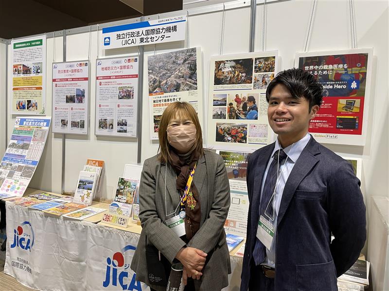 JICA東北のブースでは、JICA海外協力隊で「防災・災害対策」の職種で活動した金野利哉さんが開発した救急をサポートするアプリや、インドネシアのバンダ・アチェ市と東松島市の「相互復興」についての紹介、また国際緊急援助隊のユニフォームの試着など、JICA東北の防災事業について紹介しました。
