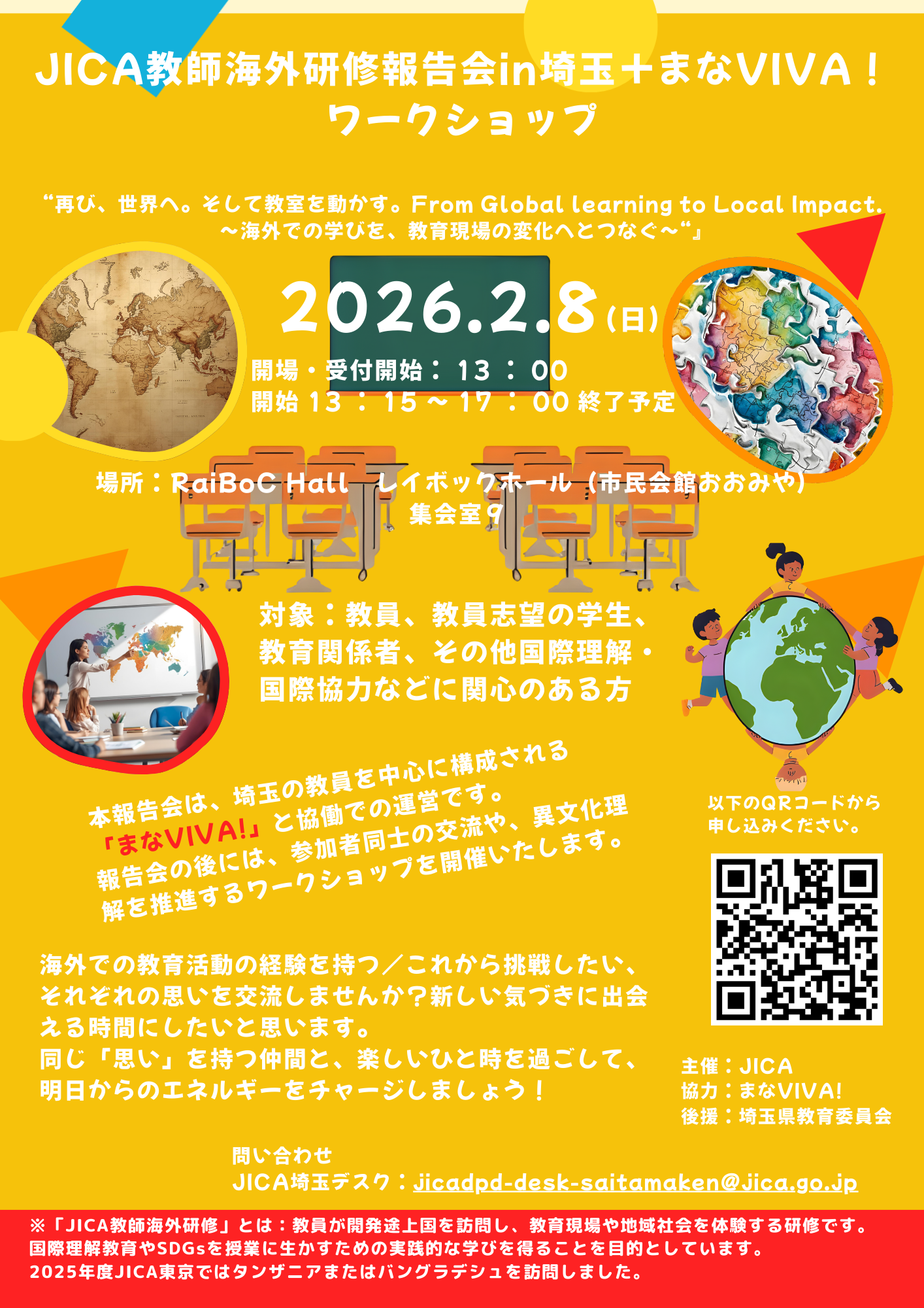 『JICA教師海外研修報告会in埼玉+まなVIVA!ワークショップ “再び、世界へ。そして教室を動かす。From Global learning to Local Impact. ~海外での学びを、教育現場の変化へつなぐ~”』