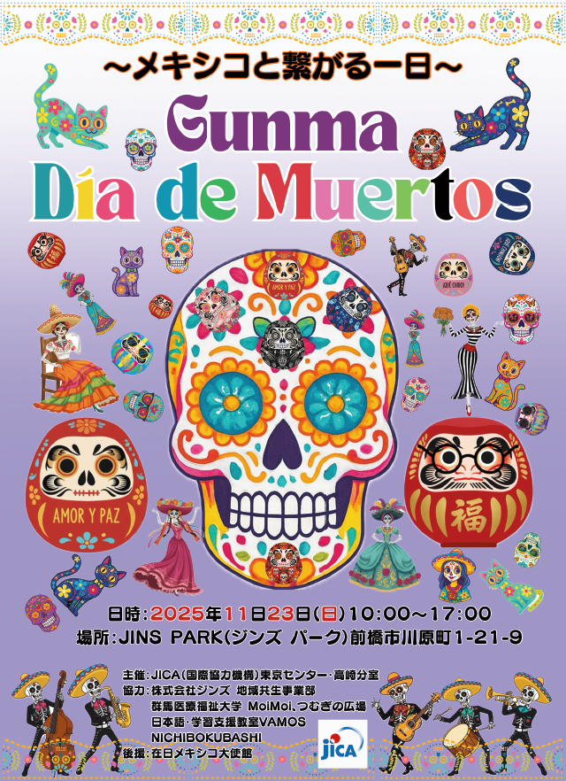 JICA東京・高崎分室は、株式会社JINS地域共生事業部ご協力のもと、JINS PARKにてメキシコの「死者の日」という伝統的な風習を紹介することを通じて市民の皆さまが国際理解を深め、多様性のある地域社会の推進に寄与すべくGunma Día de Muertos~メキシコと繋がる一日~を開催します!