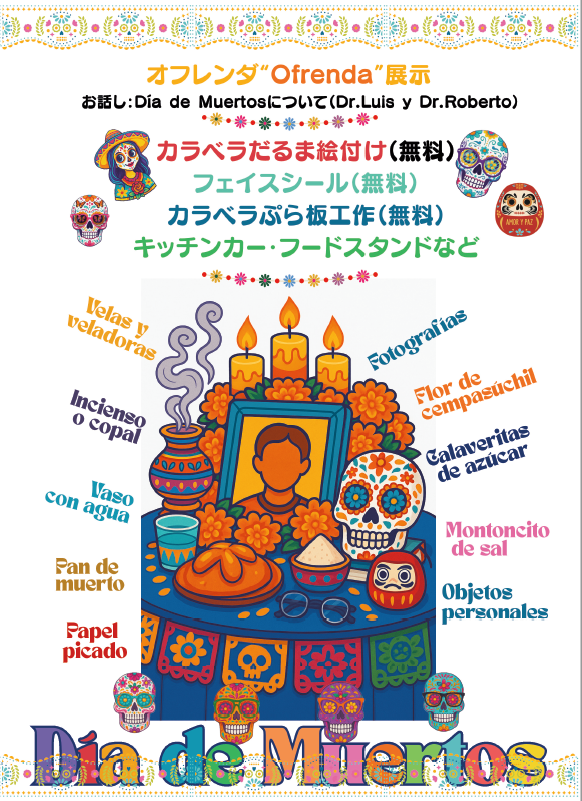 当日は、群馬医療福祉大学国際交流サークル MoiMoi、地域交流サークル つむぎの広場、日本語学習支援教室VAMOSといった地域の皆さまにご協力いただきながら、オフレンダ(祭壇)展示やカラベラだるま絵付け、フェイスシールやプラ板工作等のアクティビティを実施します。