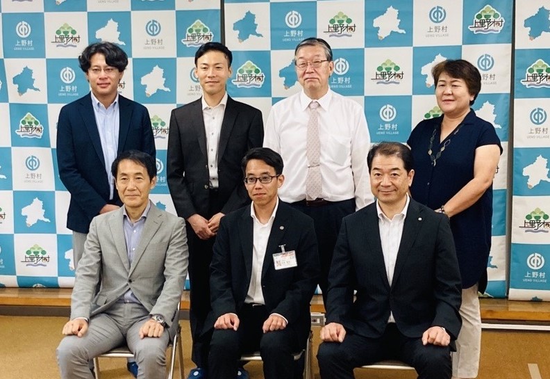 上野村表敬(下段右から黒澤村長、狩倉さん、上段左から五十嵐校長、飯出教育長)