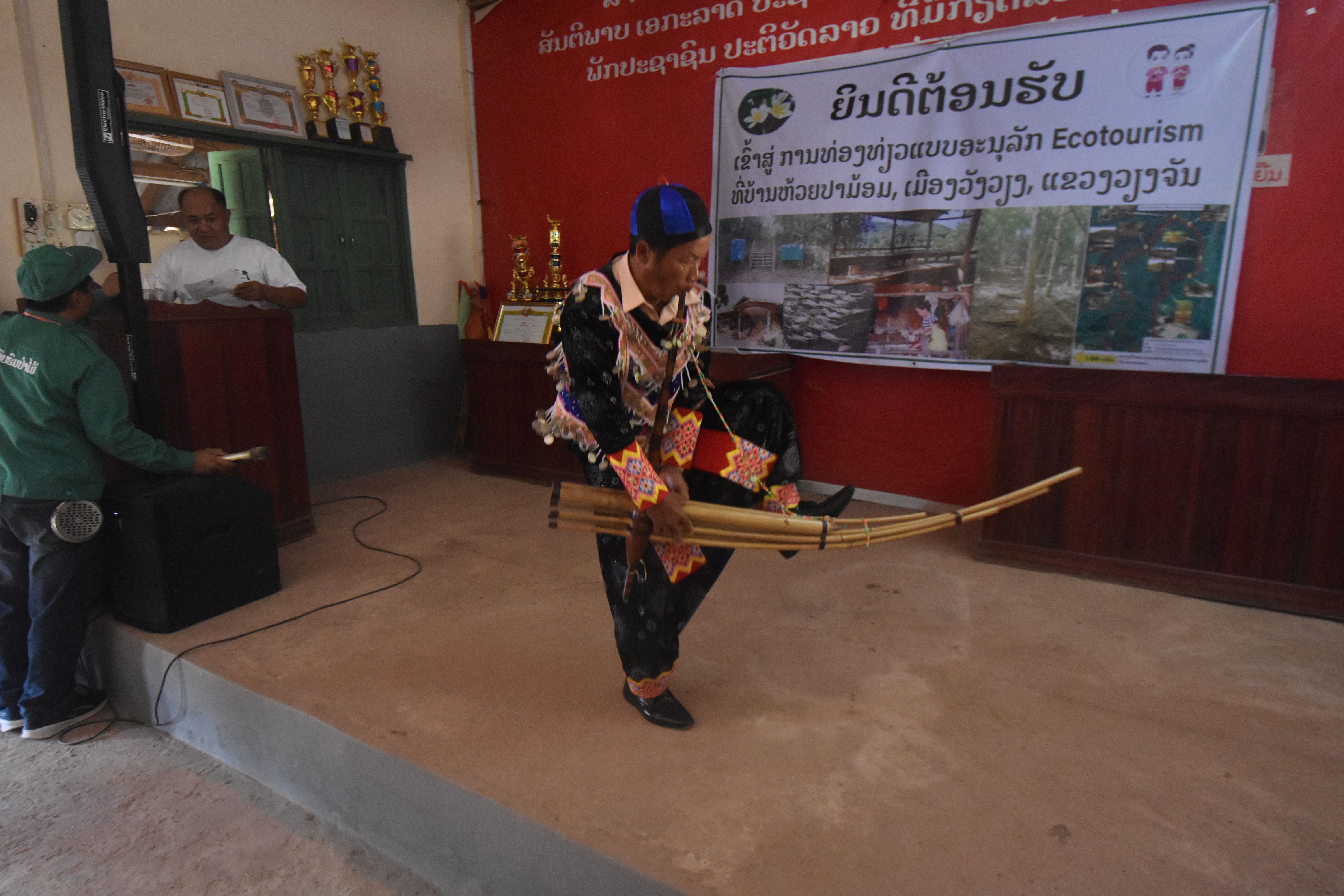 エコツアー後には、昼食を含むラオス文化体験がありました。このプログラムは、ファイパーモン村の住民が意見を出し合い、自ら企画を考えました。また、ファイパーモン村の村長が隣のターフワ村、シビライ村の村長に呼び掛け、3つの民族(ラオ族、モン族、カム族)がそれぞれの民族衣装をまとい、楽器演奏や歌などを披露しました。お正月やお祭りの場でないとなかなか接することができないラオス文化を体験することができる、ツアーの見どころのひとつです。
