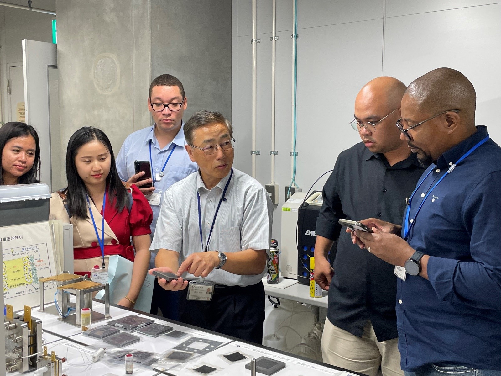 燃料電池分野の最先端の研究を行っている水素・燃料電池ナノ材料研究センターでは、センターの燃料電池研究の歴史、電池の発電効率を上げるために開発されたナノ材料や、巨大な電子顕微鏡などの最新設備について説明を受けるとともに、実際に研究施設を見学させていただきました。研究者の皆さんが作業をされている所にお邪魔して、燃料電池を手に取って間近に眺めてみたり、重さに驚いたりと、研修員も学生に戻ったような気持ちで先生から説明を受けていました。