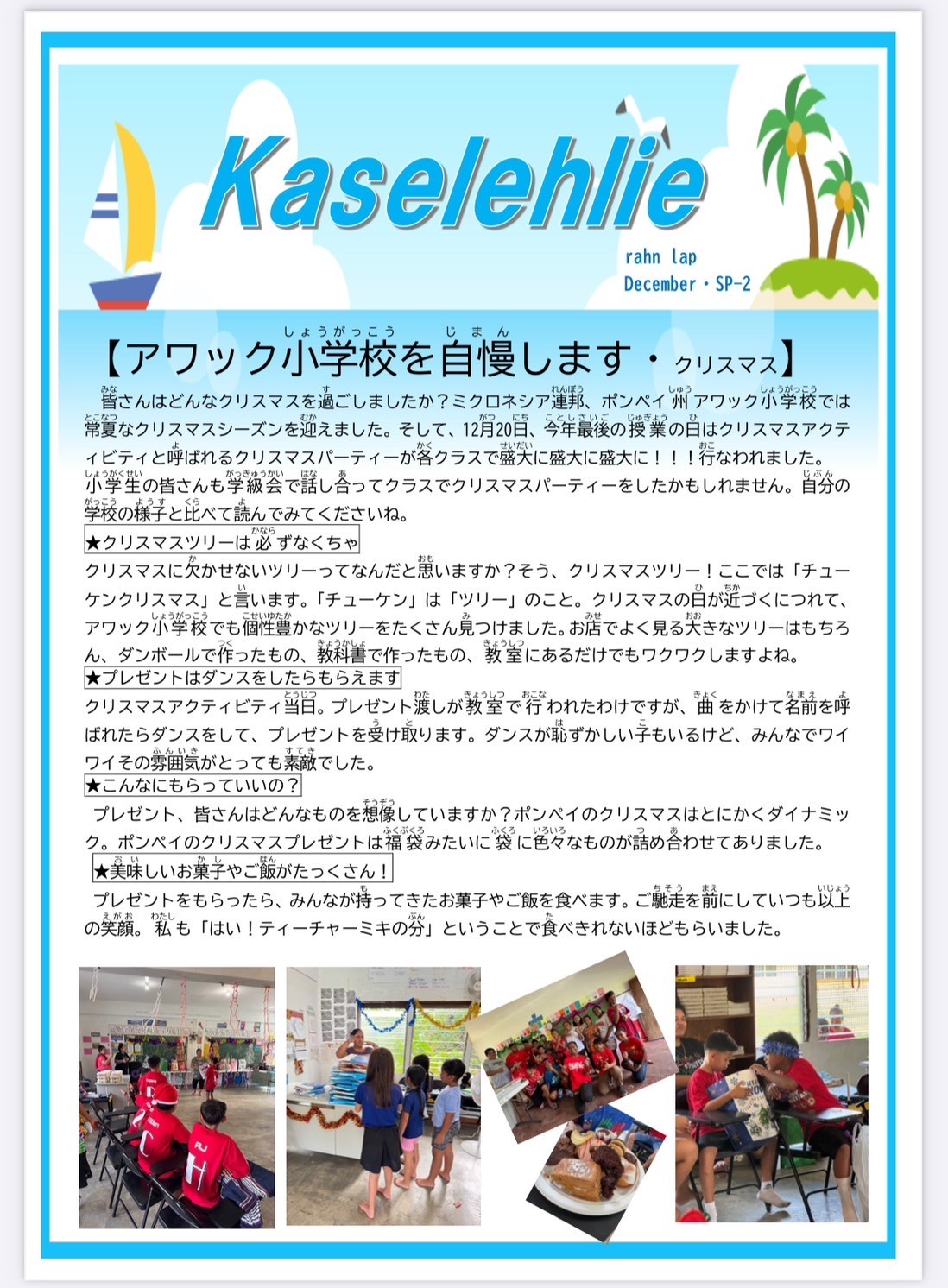 12月に入ると、常夏のミクロネシアもクリスマスムード。日本とは異なる学校やホストファミリーとのクリスマスやお正月について共有してくれました。