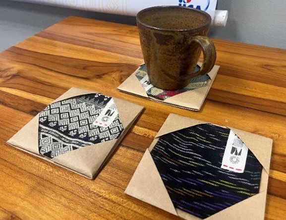 NIDによる観光商品開発事業では、住民の家に眠っていた「シン」に着目し、その生地を使い、コースターやバッグといった観光商品へアップサイクル。その商品の販売を通じて、女性住民自身が収入向上へと繋げていきます。