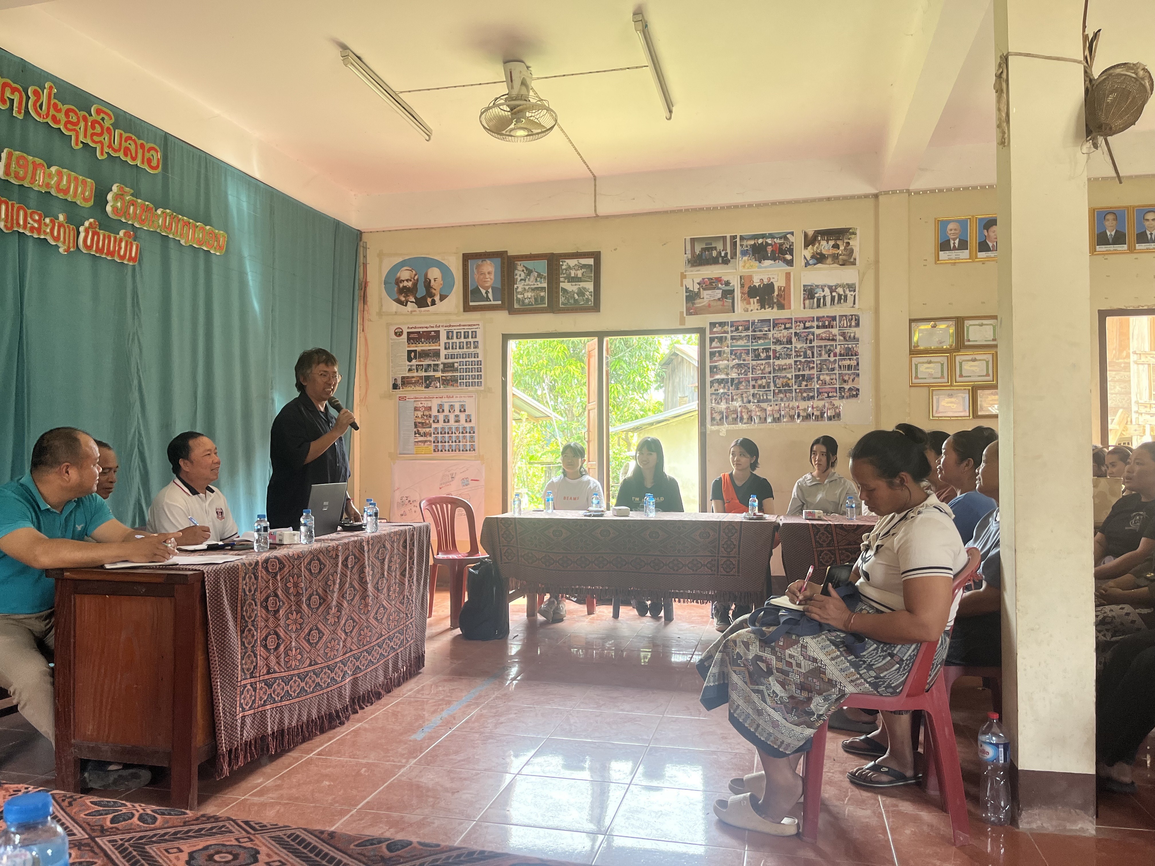 本事業では、これまでの活動で取り組んだ村に加え、県内の少数民族の村への展開も行います。新フェーズの活動の第一歩として、NIDのプロジェクトメンバーが住民への説明会を開催。今回は、民族独自の織物でも有名な「タイダム族」のシェンキョウ村で開催しました。説明会参加者は50名ほどにのぼり、本事業での取り組みに対する住民の関心の高さが伝わってくるものでした。参加住民からは、『これからNIDと共に、「シン」の生地を活用したアップサイクル商品を作りたい』といった声も聞かれました。