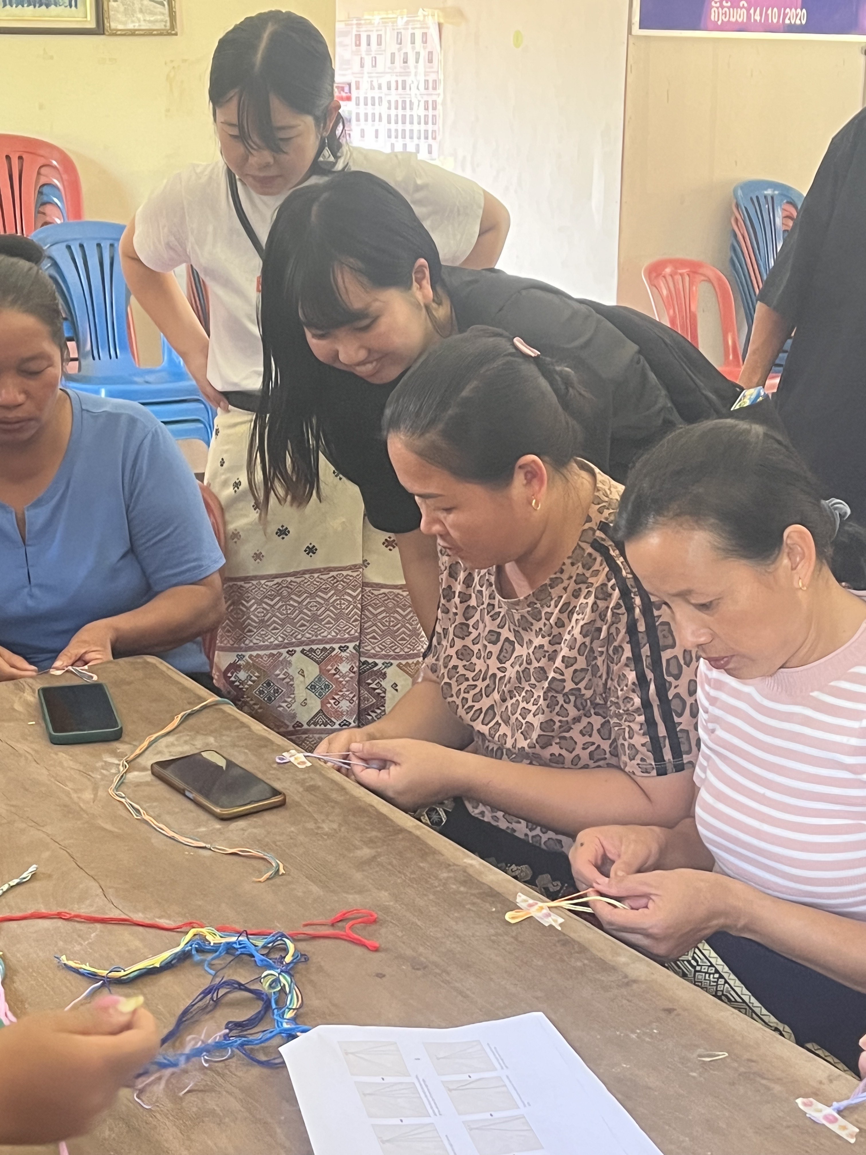 また、村の女性たち向けに、NIDの学生が組紐によるブレスレット制作のワークショップも開催。参加した女性住民の皆さんはワークショップの中ですぐに技術を習得し、独自のアレンジを加えつつ、楽しみながら取り組んでいました。