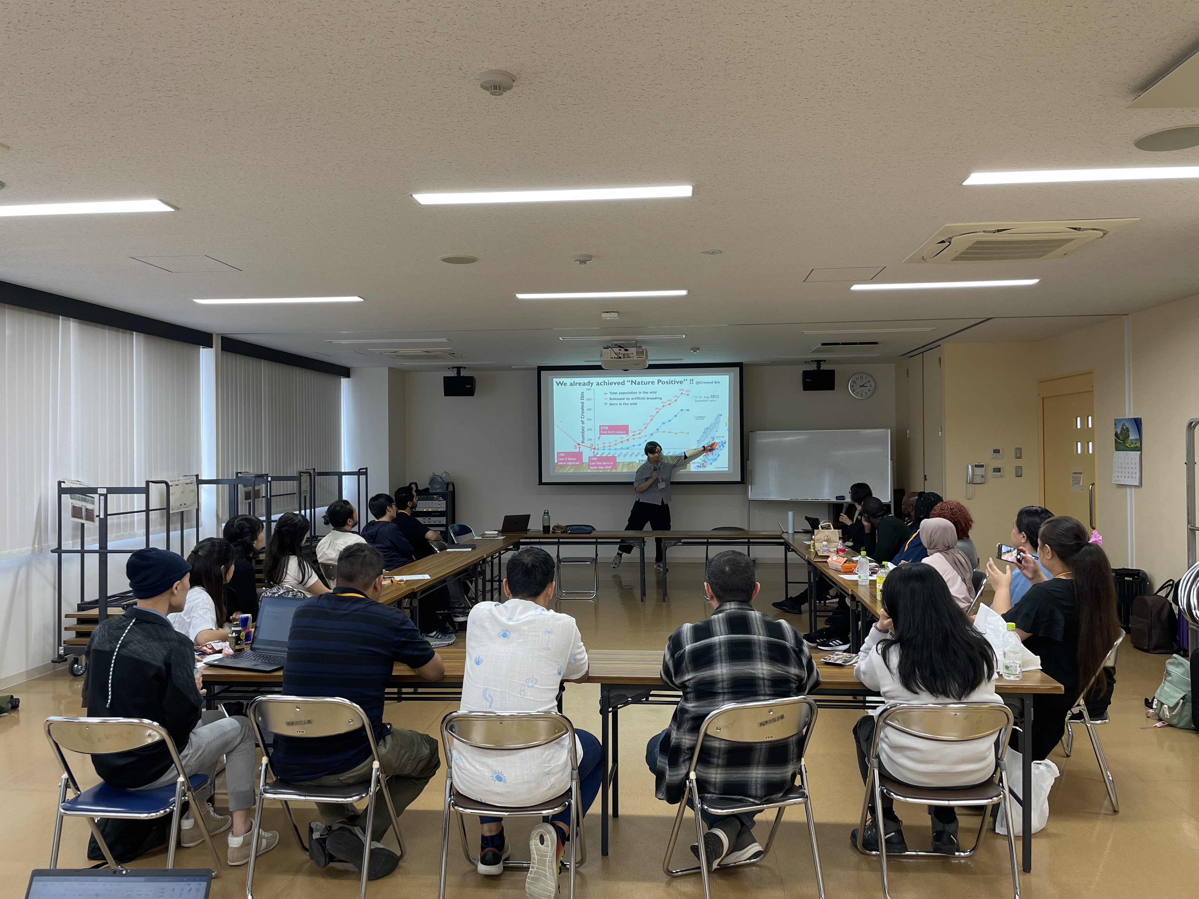 初日には、佐渡市役所農林水産部の五十嵐麻湖さんによる講義により、佐渡の金銀鉱山発展、棚田の整備、トキ保護活動など、地域独自の歴史や自然との共生を目指す「トキと共生する佐渡の里山」づくりの取り組みと課題について学びました。 講義の中では多くの質問が寄せられ、インドネシア出身のリスマヤニさんは「インドネシアでも農村部の開発は進んできているが、佐渡のように自然環境を守りながら進めることが重要だ」と語り、自国の状況と照らし合わせながら佐渡の事例に耳を傾けていました。