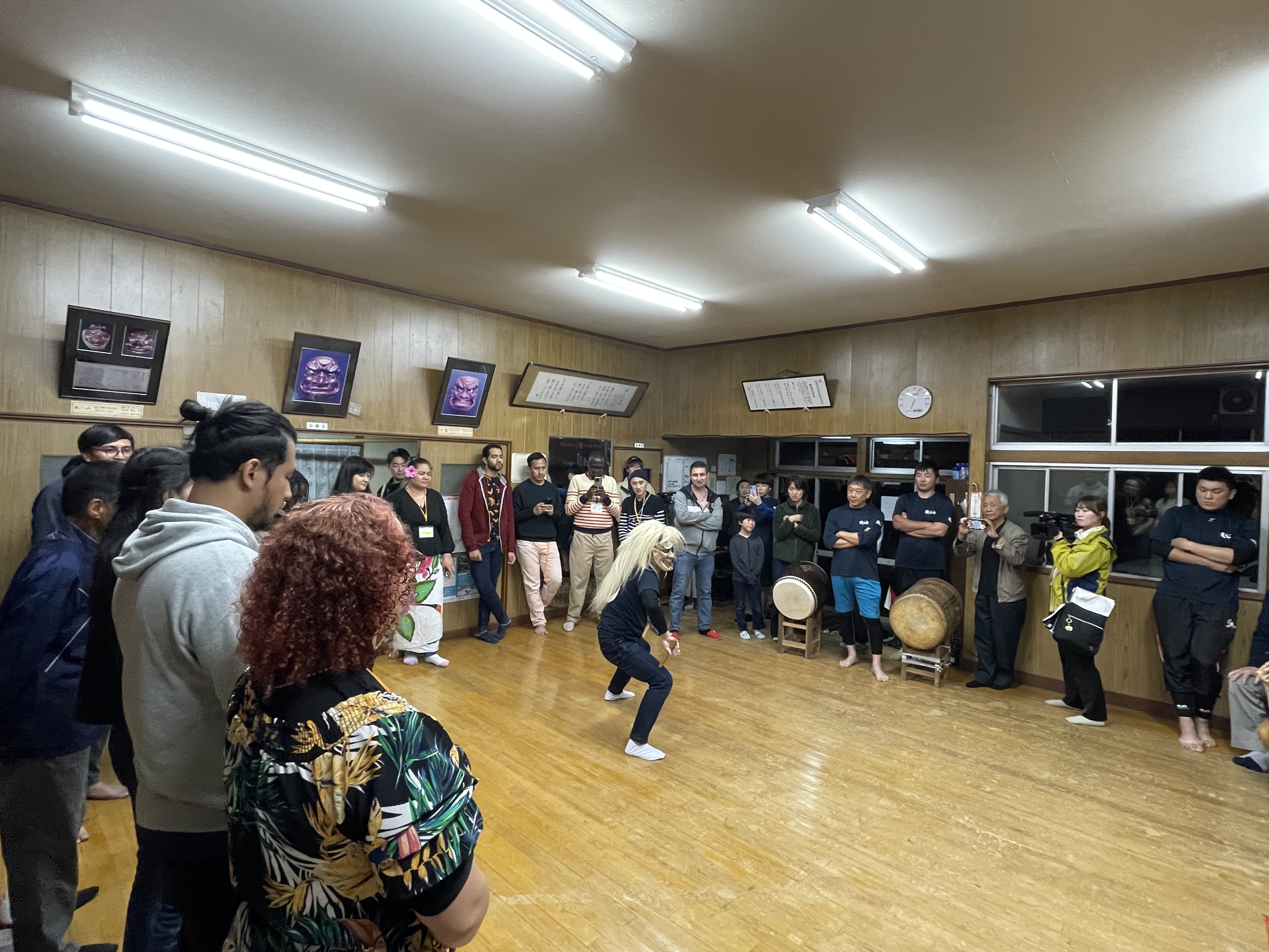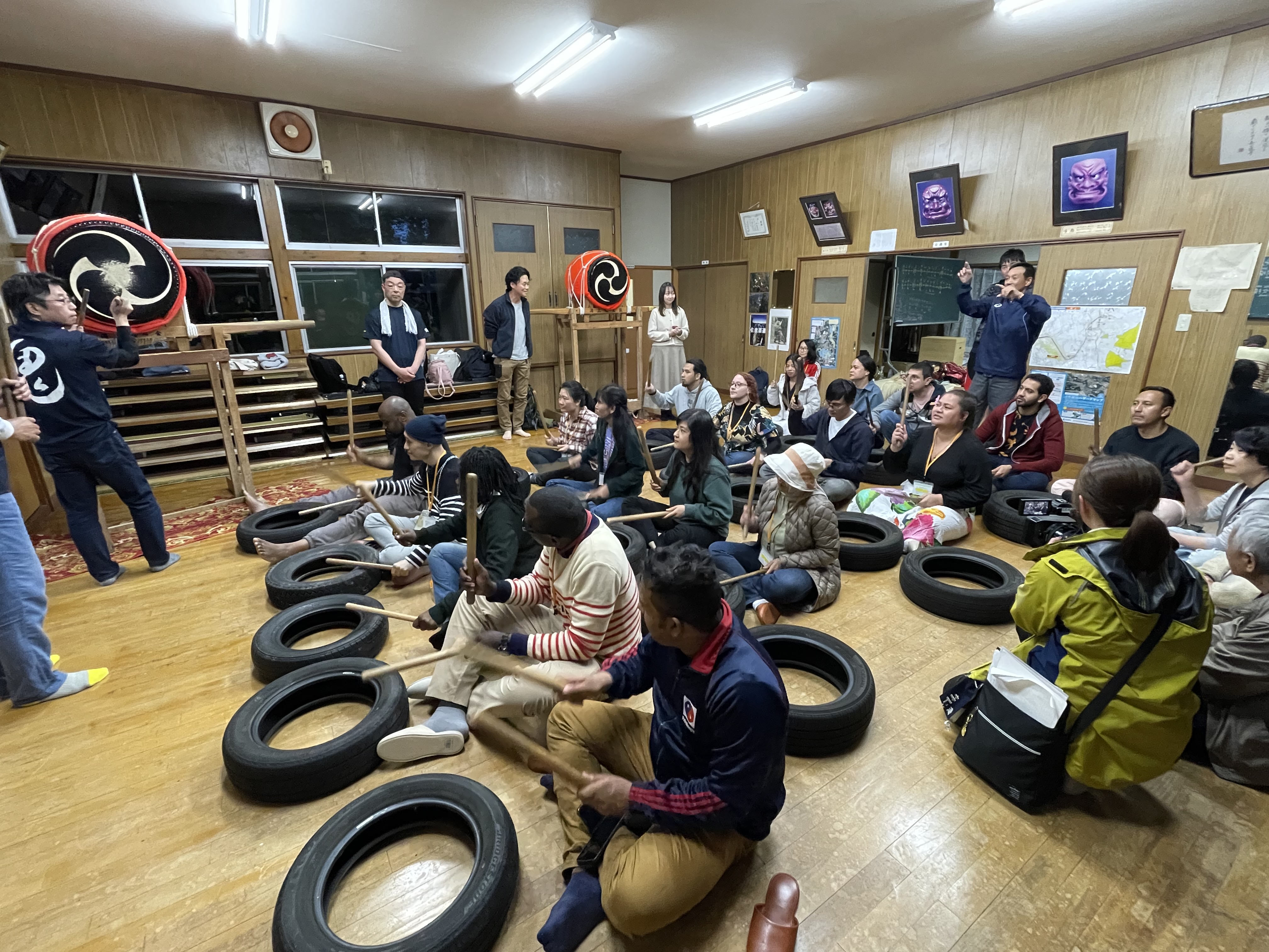 夕方からは佐渡の伝統芸能である鬼太鼓(おんでこ)を潟上集落「誠心会」の皆さんのご協力のもと体験しました。まずは誠心会の方々による舞の披露があり、太鼓の迫力あるリズムに留学生たちは圧倒されていました。