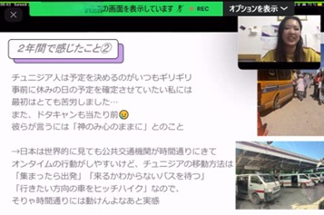 午後の部では、チュニジアに派遣中のJICA海外協力隊員・関田琴音さんが、協力隊に参加した経緯や現地での活動・暮らしについて紹介しました。関田さんが現地での経験をもとに用意してくれたテーマについて、参加者全員で意見交換を行いました。