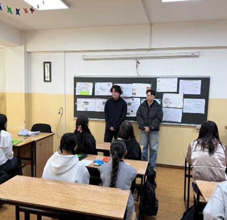 後半は文法授業を見学しました。内容は「動詞を”た”形に直す」というもので、教師が「食べる」などと書かれたカードを提示し、学生たちが一斉に「食べた」と答える形式で進行していました。暗記中心ではなく、学生が積極的に発話することを重視した授業構成であり、言語学習には「使って覚える」ことが最も効果的であると改めて感じることができました。授業の最後には質問カードを用いたペア会話活動が行われ、私たちも学生と会話に参加し、日本語能力は前のクラスより低いと説明を受けましたが、実際には理解力も高く、自然な会話が成立していました。また、モンゴルの学生が日本文化に強い関心を持っていることに感銘を受け、日本という国が多くの人々にとって憧れの存在であることを実感しました。