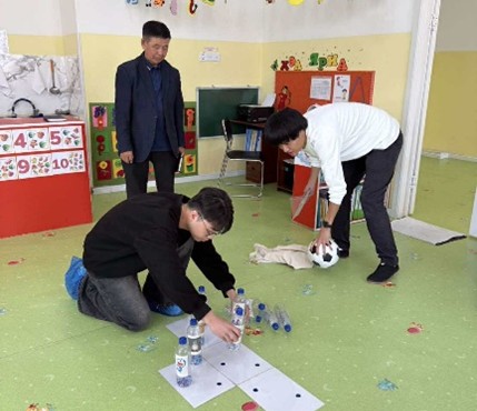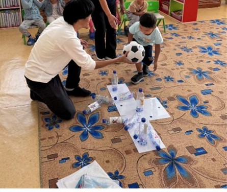 この日はウランバートルから離れたバガノール地区を訪問し、障害児・者支援隊員が勤務する幼稚園を見学しました。当該幼稚園は障害児向けではなく、保護者が仕事で多忙な家庭の子どもを預かる施設でした。日帰りで通う子どももいれば、週末のみ帰宅する子どももいると伺いました。今回の訪問目的は、ここで活動している障害児・者支援隊員の活動体験でした。この日は子どもたちに「日本のボウリング」を教える活動が行われ、隊員が汗を流しながら全力で子どもたちと向き合う姿に感動しました。子どもたちは笑顔で楽しみながら参加し、最後に最も得点の高い子どもに手作りのメダルが授与されました。しかし、惜しくも勝てなかった子どもの一人が悔しさで泣き出してしまい、すると、メダルを受け取った子どもがそのメダルを泣いている子の首にかけてあげるという場面があり、その優しさと譲り合いの心に深く感動しました。